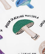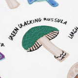 A close up of the green cracking russula fungi on the Frugi Children's Organic Ace Applique Top - White / Mushrooms.