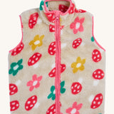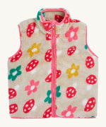 The removable  fleece gilet from the Frugi 3 in 1 dragon / mushroom rambler waterproof coat. A thick warm fleece with a full length zip in cream with a red mushroom design and pink trim