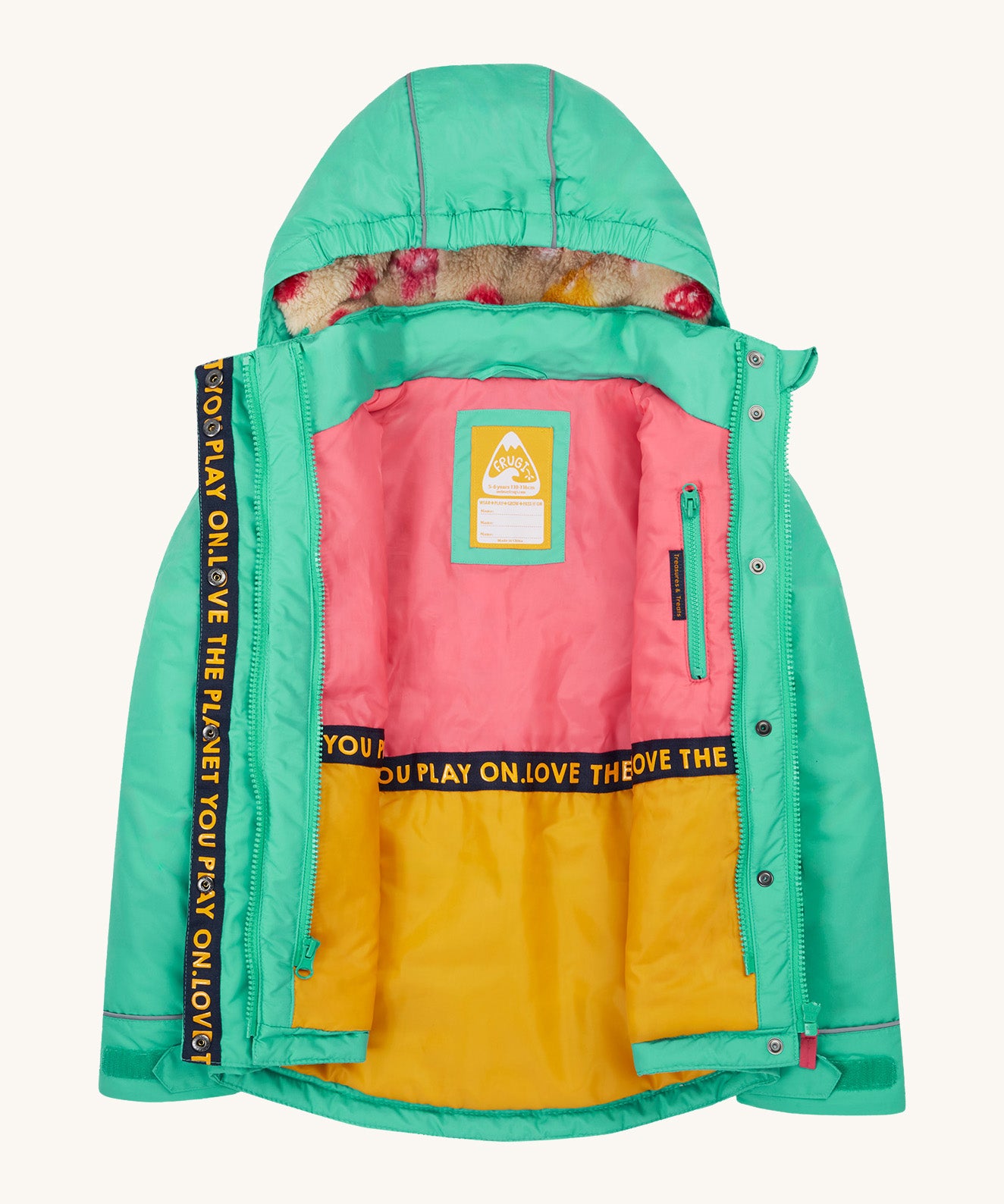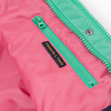 A close up of the Frugi kids 3 in 1 rambler coat in dragon/mushroom showing the hidden side pocket and bright turquoise zip detail on the inside of the coat on pink post consumer recycled polyester fabric