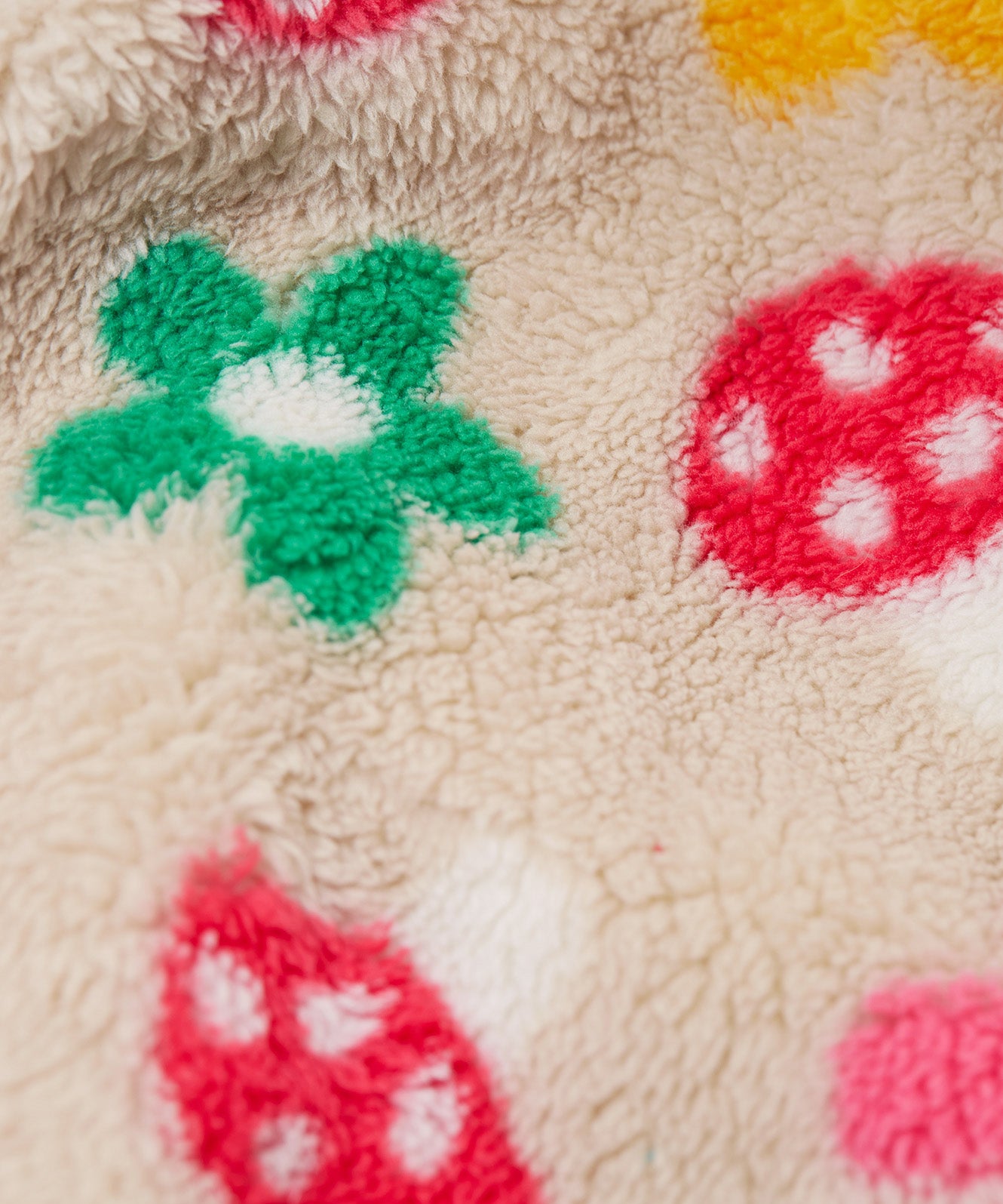 A close up of the thick cream fleece from the Frugi kids Autumn stripe/navy 3 in 1  waterproof rambler coat showing the flower and mushroom detail
