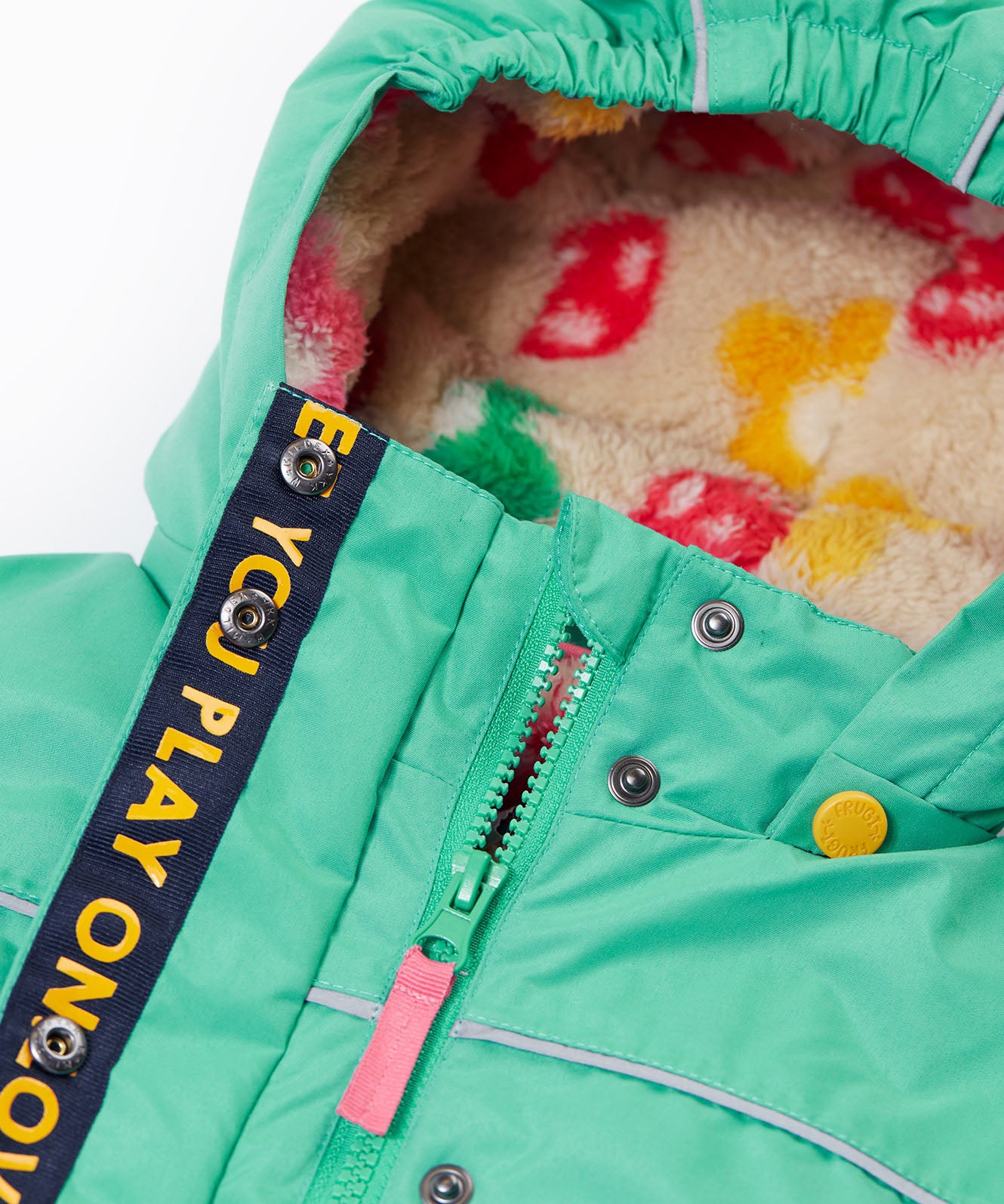 A close up of the Frugi kids 3 in 1 rambler coat in dragon/mushroom showing the zip detail and mushroom fleece liner inner on the hood