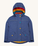 Frugi kids 3 in 1 rambler coat in autumn stripe /navy colourway. A navy waterproof coat from post consumer recycled polyester. Features a removable hood and 2 side pockets with different colour poppers