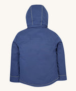 Frugi kids 3 in 1 rambler coat in Autumn stripe /navy colourway. A navy waterproof coat from post consumer recycled polyester. Features a removable hood with a fleece liner for warmth, a name tag patch on the inside and a full length zip with popper fasteners