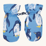 Frugi kids penguin waddle snow mittens. A pair of recycled polyester winter mittens in a light blue with waddling penguins. Features a black clip on each mitten to attach on a ski coat.