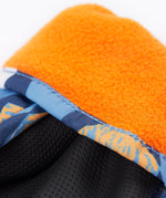 A close up of the Frugi kids penguin waddle snow mittens showing the black grippy palm and orange fleece inner for warmth