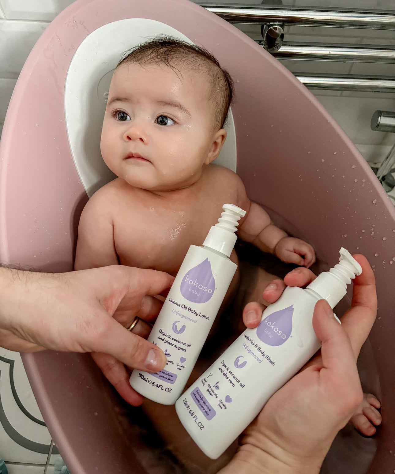 An adult hand holding the Kokoso unscented organic gentle hair & body wash and the baby lotion above a baby in a bath. Both are available at Babipur.