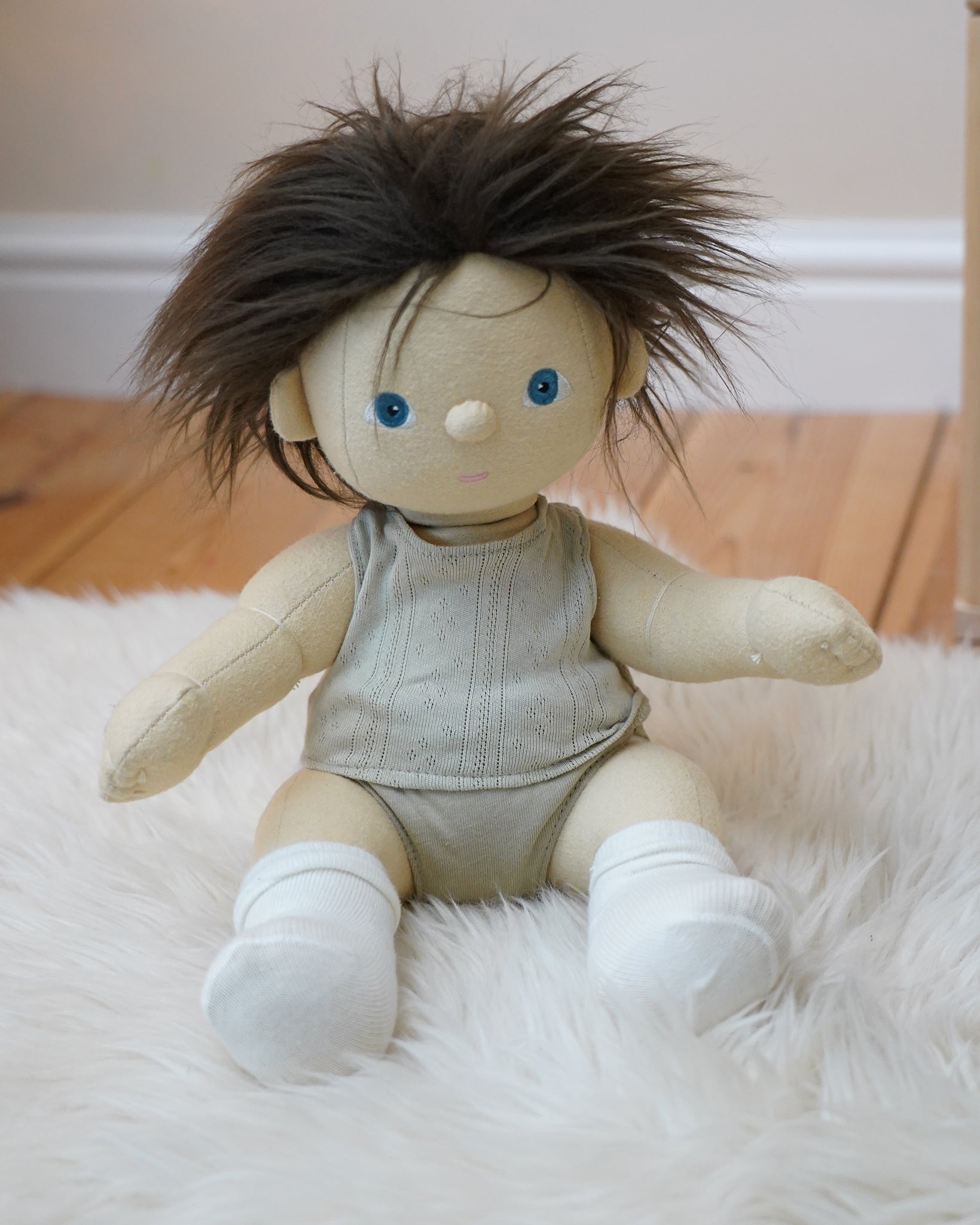 Olli Ella Dinkum Doll wearing a vest and pants from the sage pointelle PJ set, it also comes with a matching babygrow - for sale at Babipur.