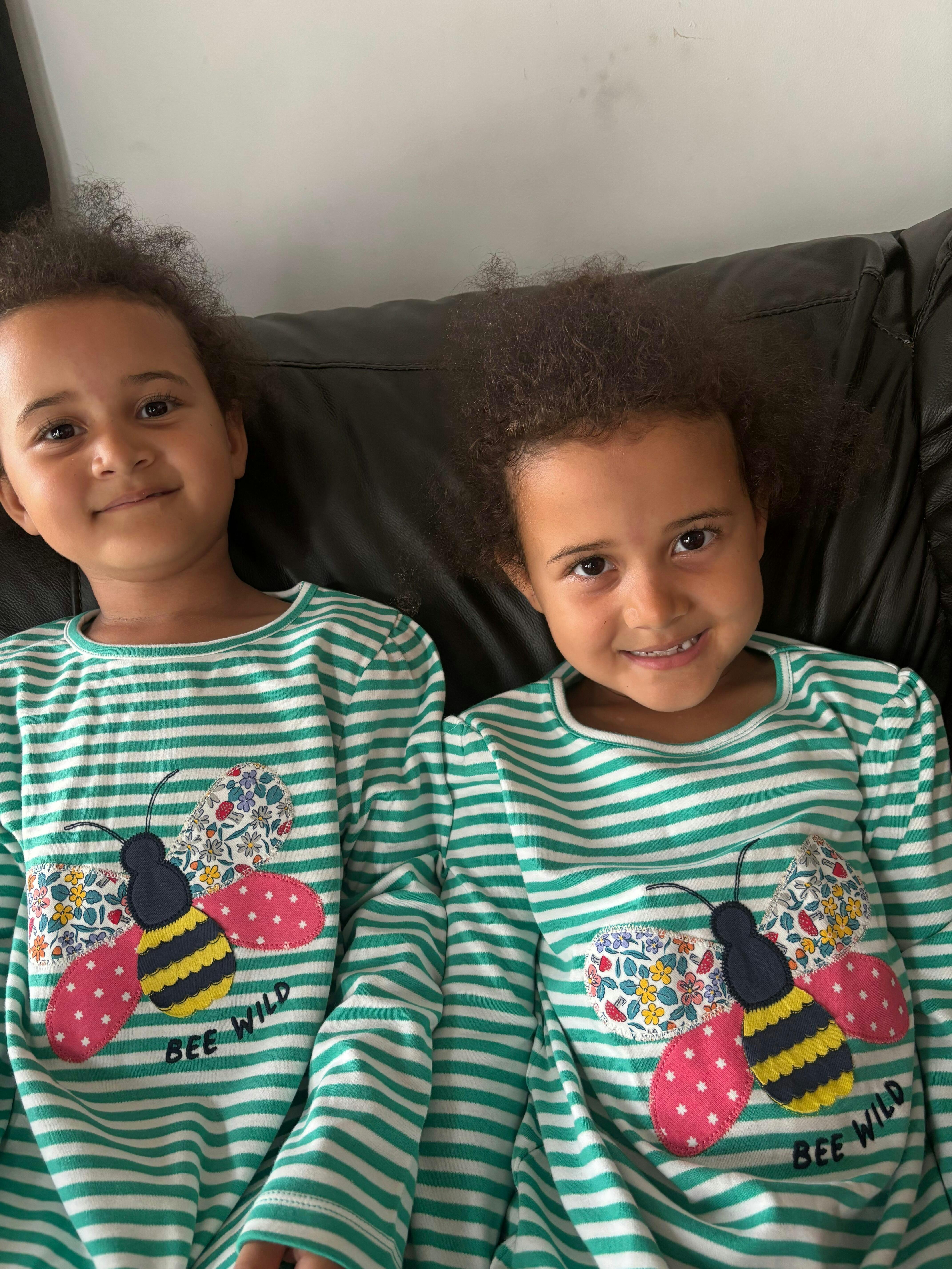A child wearing the Frugi sofia skater dress in tulip/fun flowers and standing next to another child wearing the tulip fun flowers leggings with the Frugi dragon stripe/bee top available at Babipur