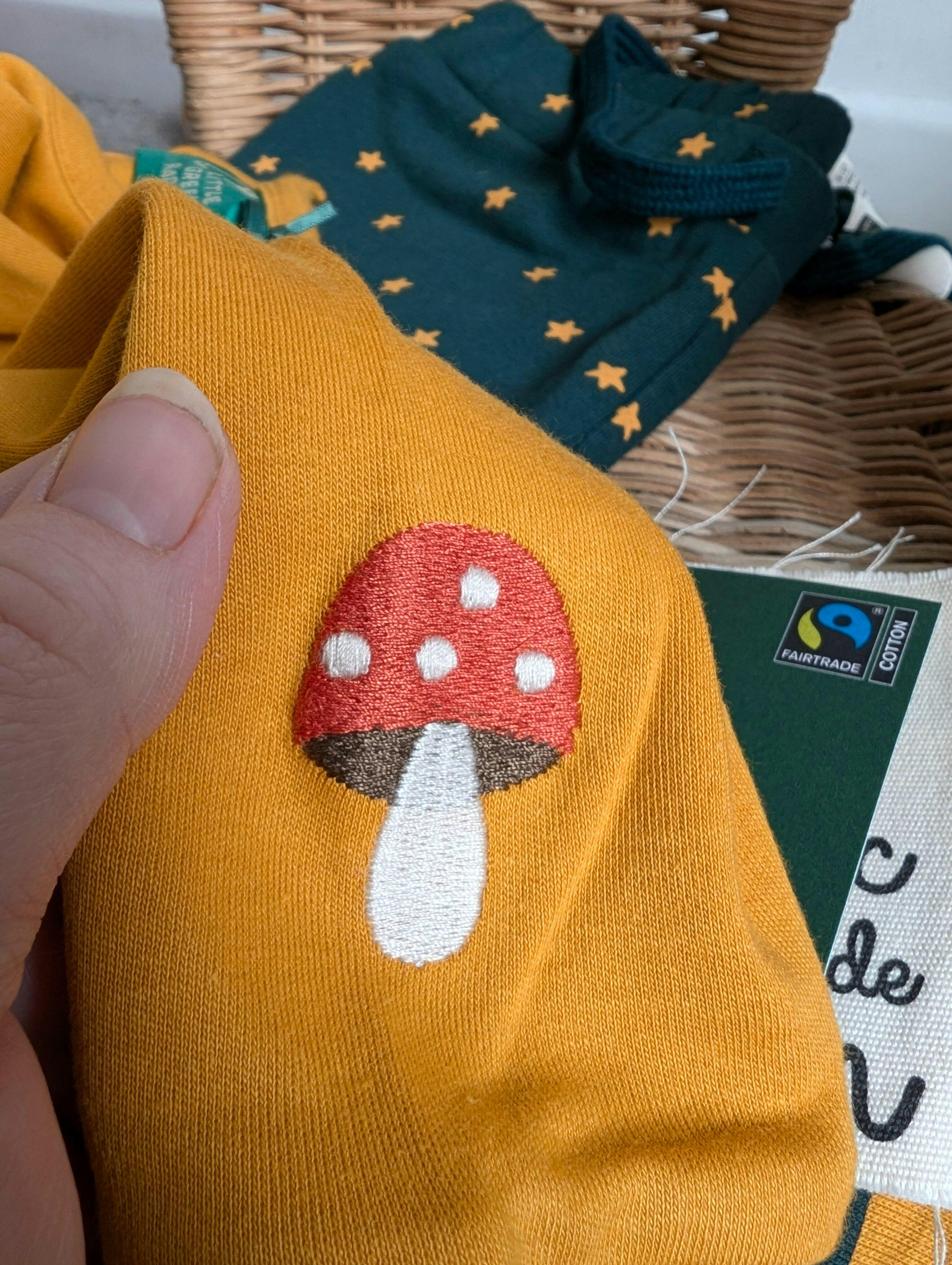 We got this top to go with our star print joggers and it's a perfect match. I've always loved the LGR yellow gold colour , fits in well throughout all the seasons. The material feels luxuriously thick and you can just tell it's a quality piece of clothing from the feel of it. My 2 year old knows the sound that owls make so that was a bonus. I love the attention to detail on LGR clothing this top has a little embroidered toadstool on one sleeve which is super cute.
