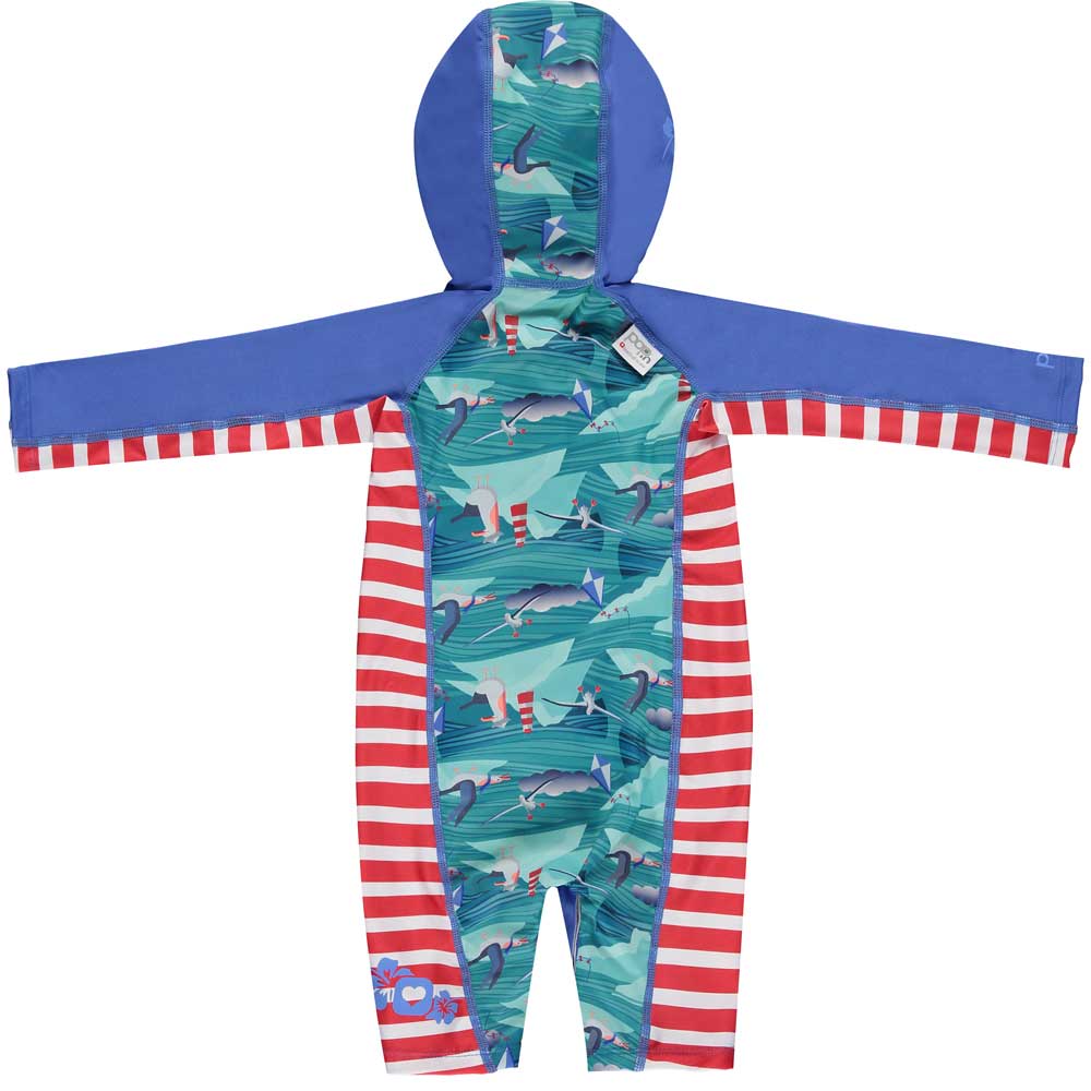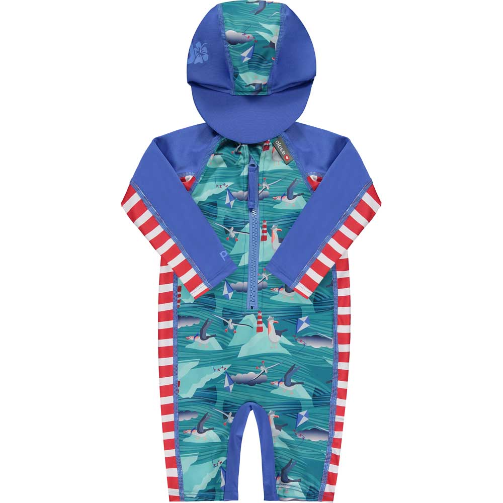 This Close Pop-In Albatross All-In-One is a sun-safe suit for toddlers and children. It has a blue body with a super cool short-legged albatross pattern, sleeves and side panels and a hood with a blue peak. Watch as Chester and Mabel glide through the turbulent windy skies over the sea flying through lighthouses and kites!