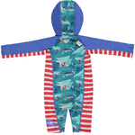Sizes Med to XL have poppers on the gusset for easy nappy changes and trips to the loo. Sizes 2XL and 3XL have fixed legs. The full-length sleeves and knee-length shorts, hood and UPF50+ fabric provide excellent sun protection. Perfect for the beach or wearing as a swimsuit in the the pool, this all-in-one suit is great for growing water babies. Team up with a matching Pop-In Swim Nappy for toddlers who haven't yet potty trained.