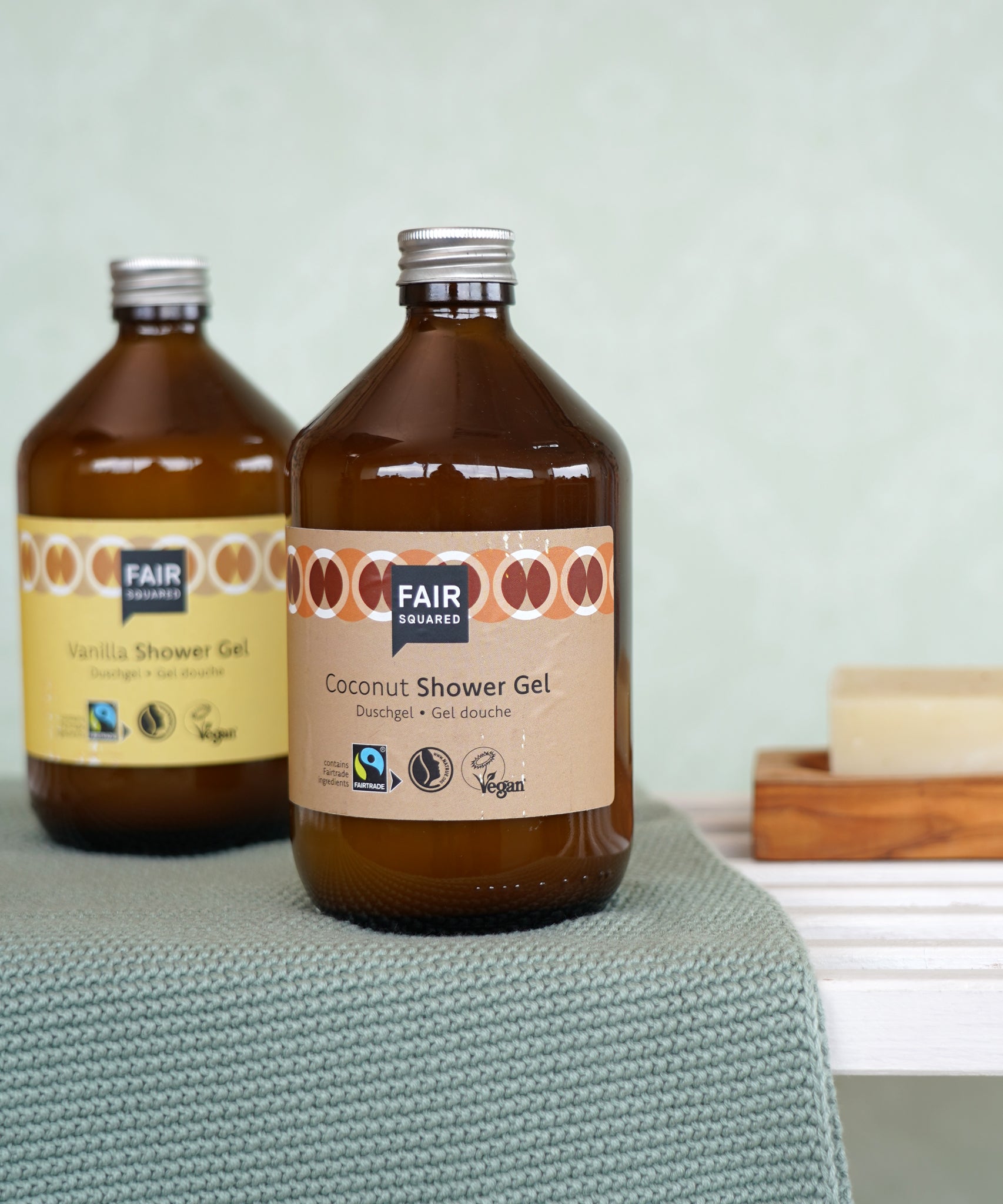 A glass bottle of Coconut Fair Squared Fairtrade Shower Gel 500ml in a bathroom - vegan, cruelty free and plastic free - for sale at Babipur.