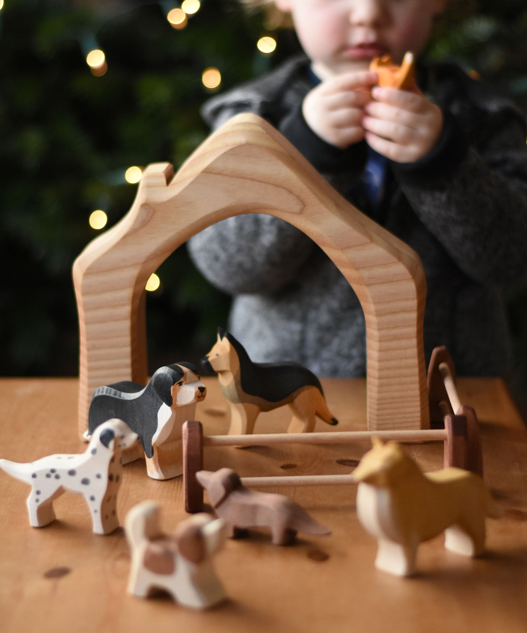 A child playing with Ostheimer dog and cat wooden toy figures.  The house shaped pieces from the 4 Piece Wooden House Parts set and wooden fences have been placed in the small world play scene.  that has been placed on a wooden table. Ostheimer have a range of wooden toy figures and scenery pieces that are perfect for small world play available at Babipur.