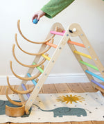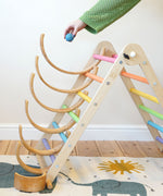 Triclimb folding wooden pikler climbing frame with pastel inspired coloured rungs including purple, blue, green, yellow, orange and pink. Features longer natural coloured rungs on the bottom as a base.
