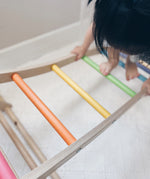Triclimb wooden wibli ladder with pastel inspired coloured rungs including pink, orange, yellow, green, blue and purple. Features Triclimb joints on one end of the ladder to hook onto a Triclimb wooden pikler climbing frame