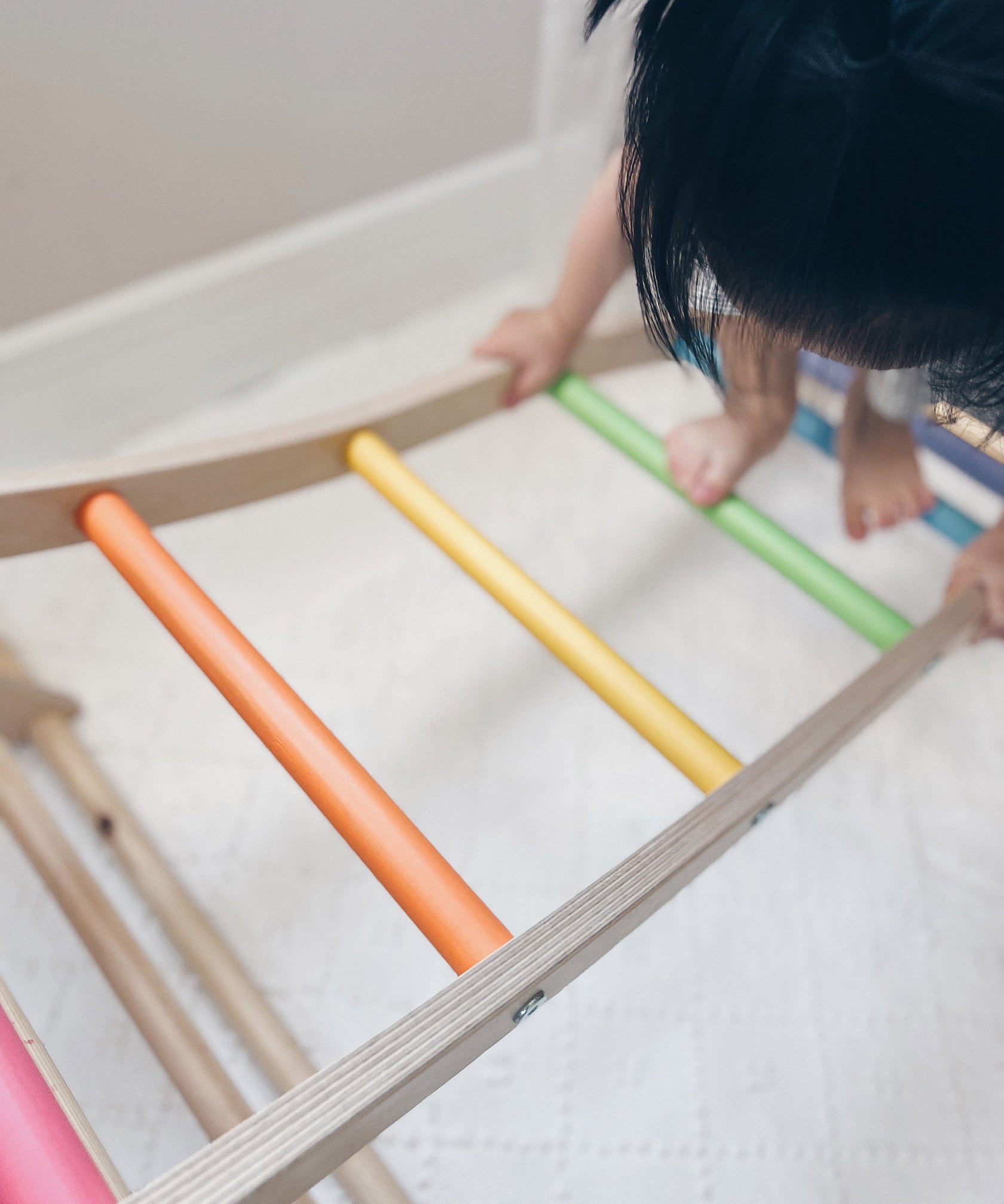 Triclimb wooden wibli ladder with pastel inspired coloured rungs hooked on a rung on the Triclimb pikler wooden climbing frame
