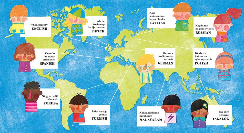 Each double page features a different country and idiom, with a map at the end showing where abouts in the world these phrases originate, and also in the language of origin. This lighthearted, entertaining look at language from around the globe is written by Susan Schubert, a former kindergarten teacher, and beautifully illustrated with colourful images by Raquel Bonita, created using hand-printed textures and colours. Can you make up your own idiom?