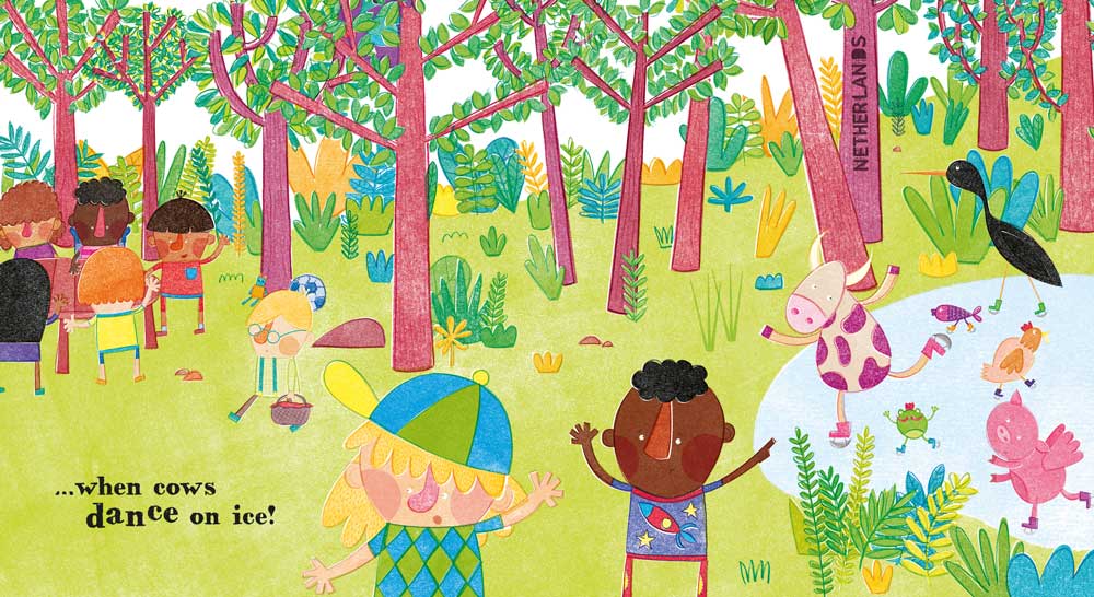 My boys (4 and 6 years old) really enjoyed this book. It looks at sayings in 10 other countries which correspond with the English saying 'I'll believe you when pigs fly'. My boys favourite one was when fish climb poplars! They also found it fun finding the animals from the sayings on the following pages!