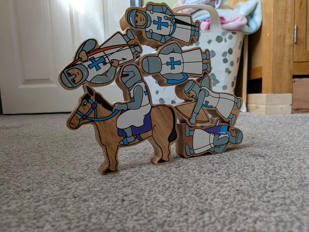 Children will love this bag of 6 Lanka Kade Blue Knights containing 2 archers, 3 swordsmen and a knight on horseback ready for adventure and battle, with a printed knight design on both sides of natural eco friendly wood. Immerse yourself in small world play with these chunky wooden figures, perfect for any castle or medieval loving warriors. Perfect for learning new skills like storytelling, colour recognition, hand eye coordination and building confidence.