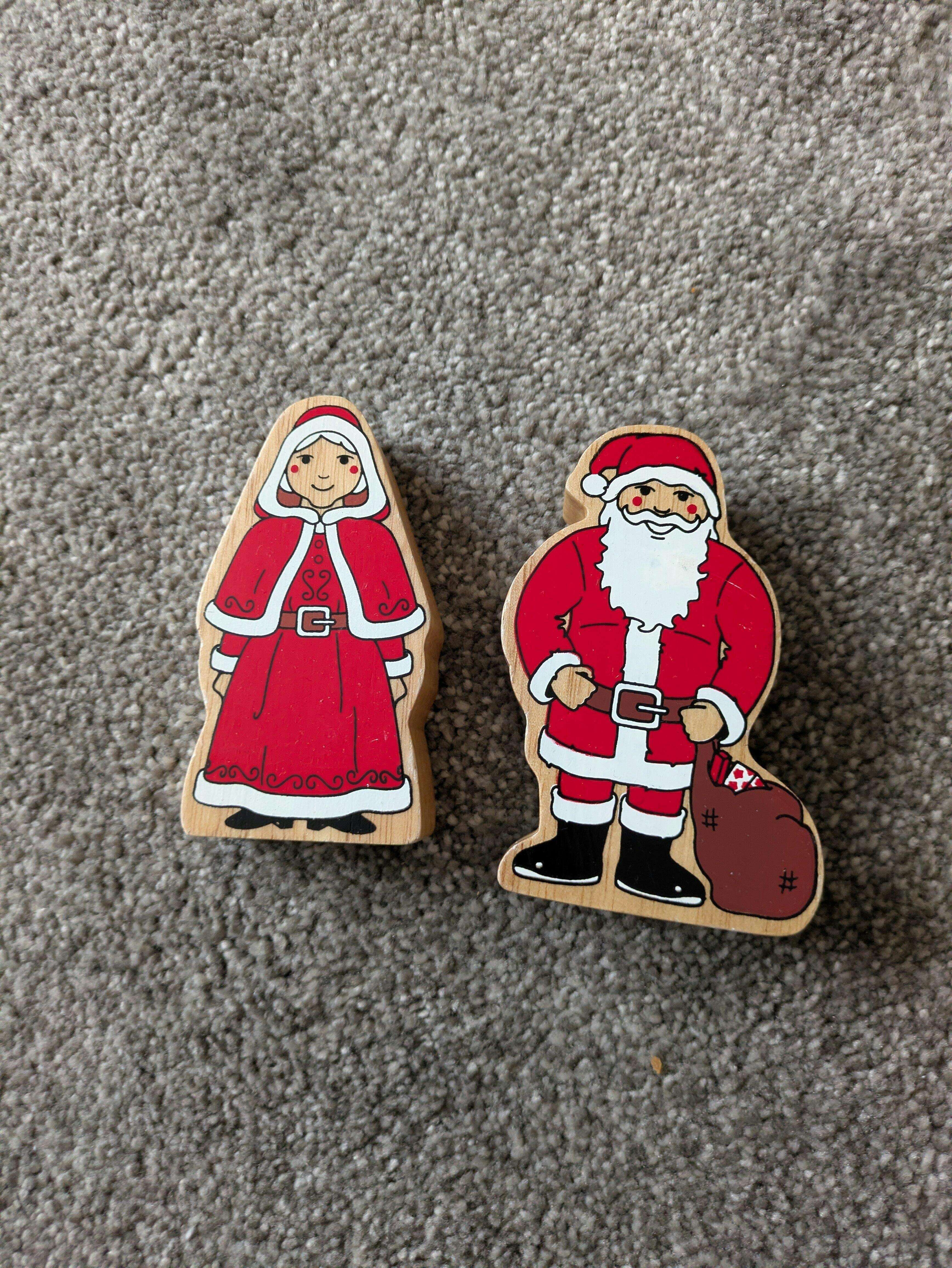 Lanka kade plastic free wooden mr and mrs claus toys stood on a white table in front of a lanka kade christmas tree and fire place