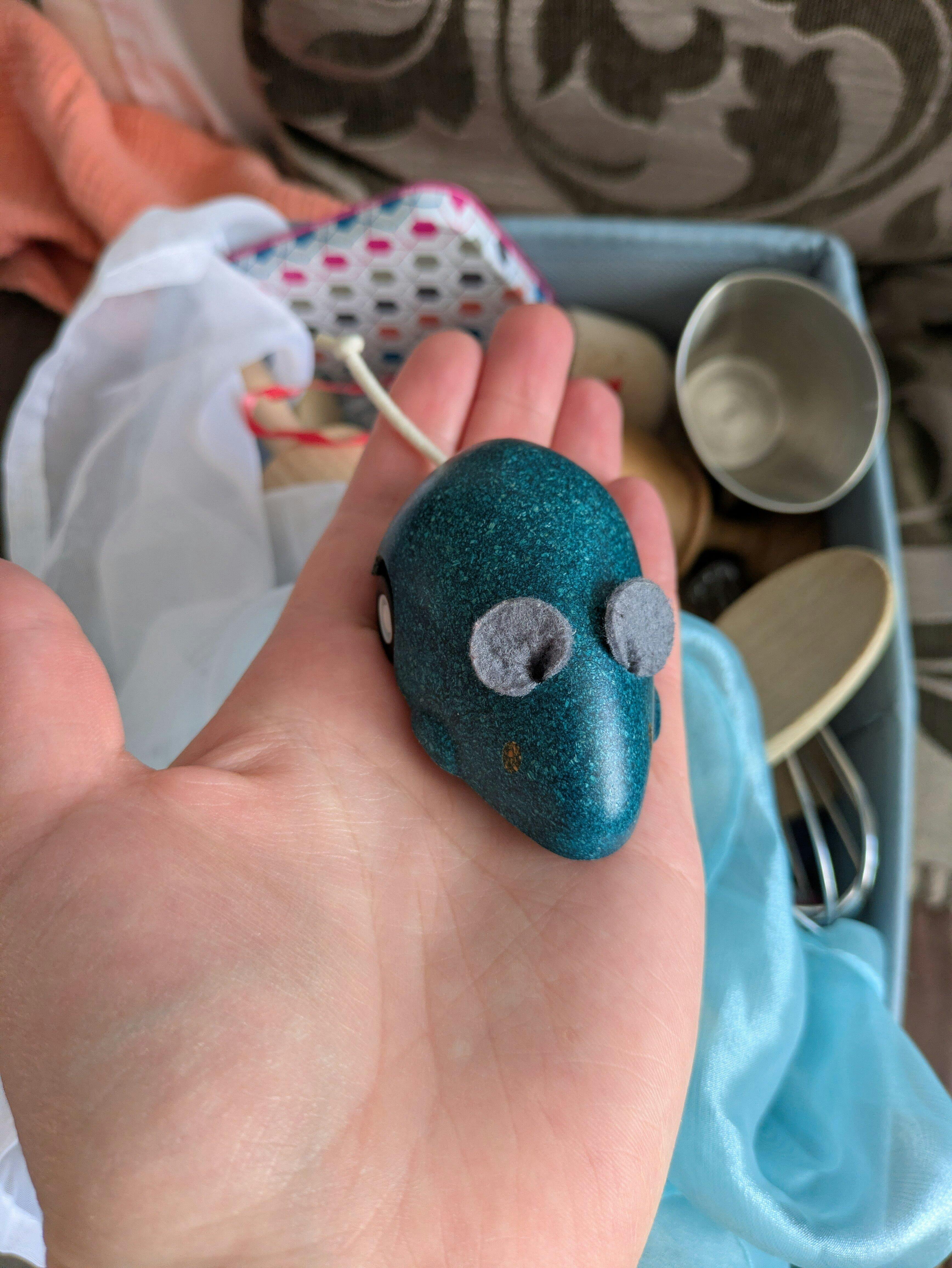 PlanToys Wooden Pull-Back Mouse Toy in blue.