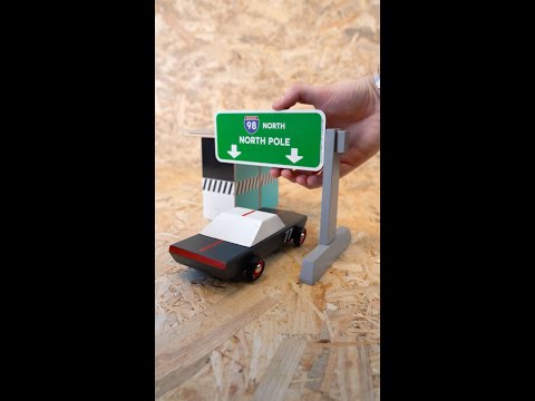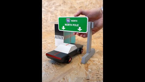 The Candylab wooden toy car toll booth for small world play, with the sign showing directions to the North Pole.