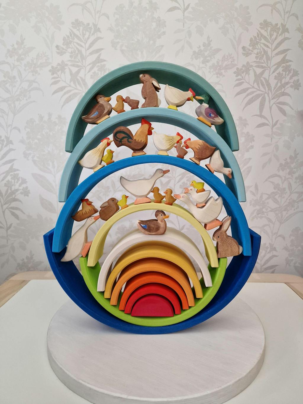 The natural wood grain is visible through the non-toxic paint, creating a feather-like appearance that is smooth and warm to the touch.