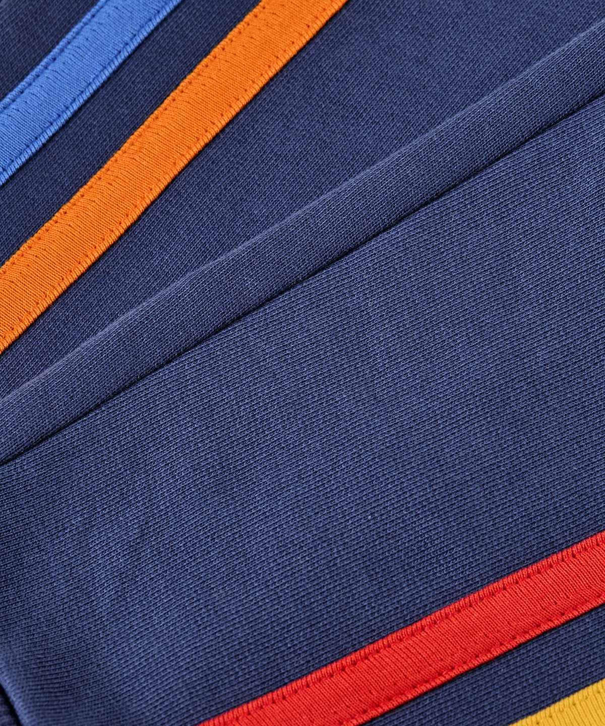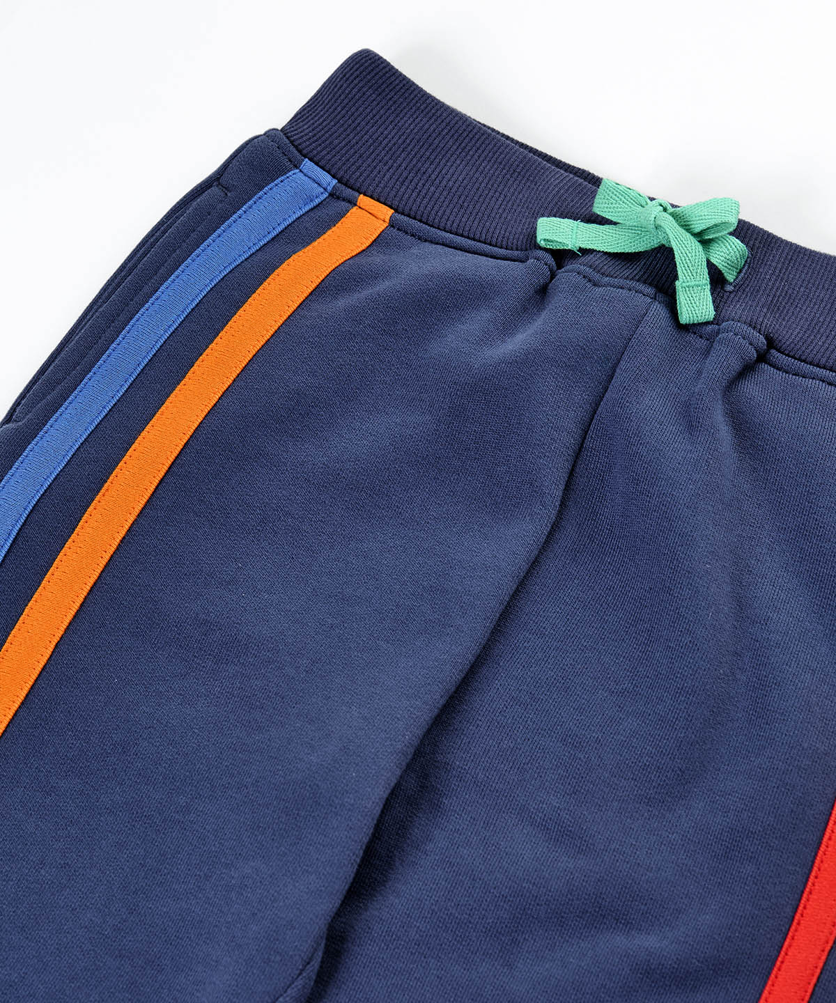 A close up of the navy frugi joggers laid flat showing the orange and light blue stripe design on the leg with a turquoise waist tie