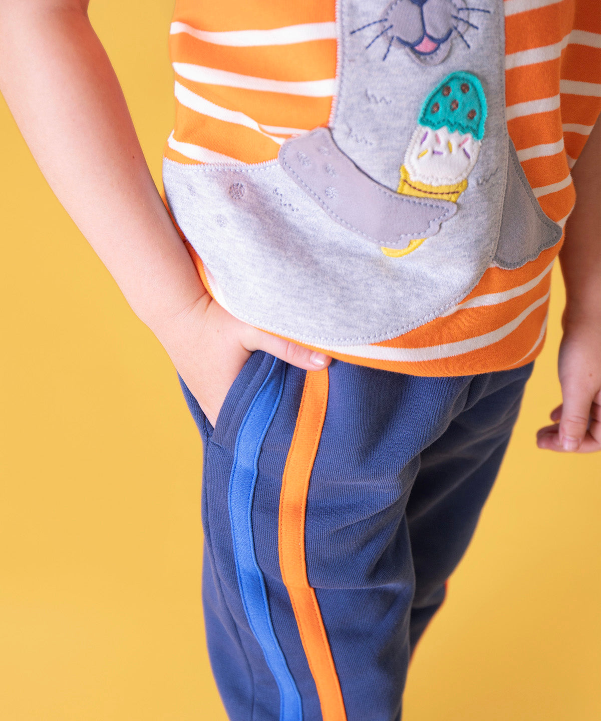 A close up of a child wearing a orange and white stripe tshirt with their hand in the pocket of the navy with stripes joggers.