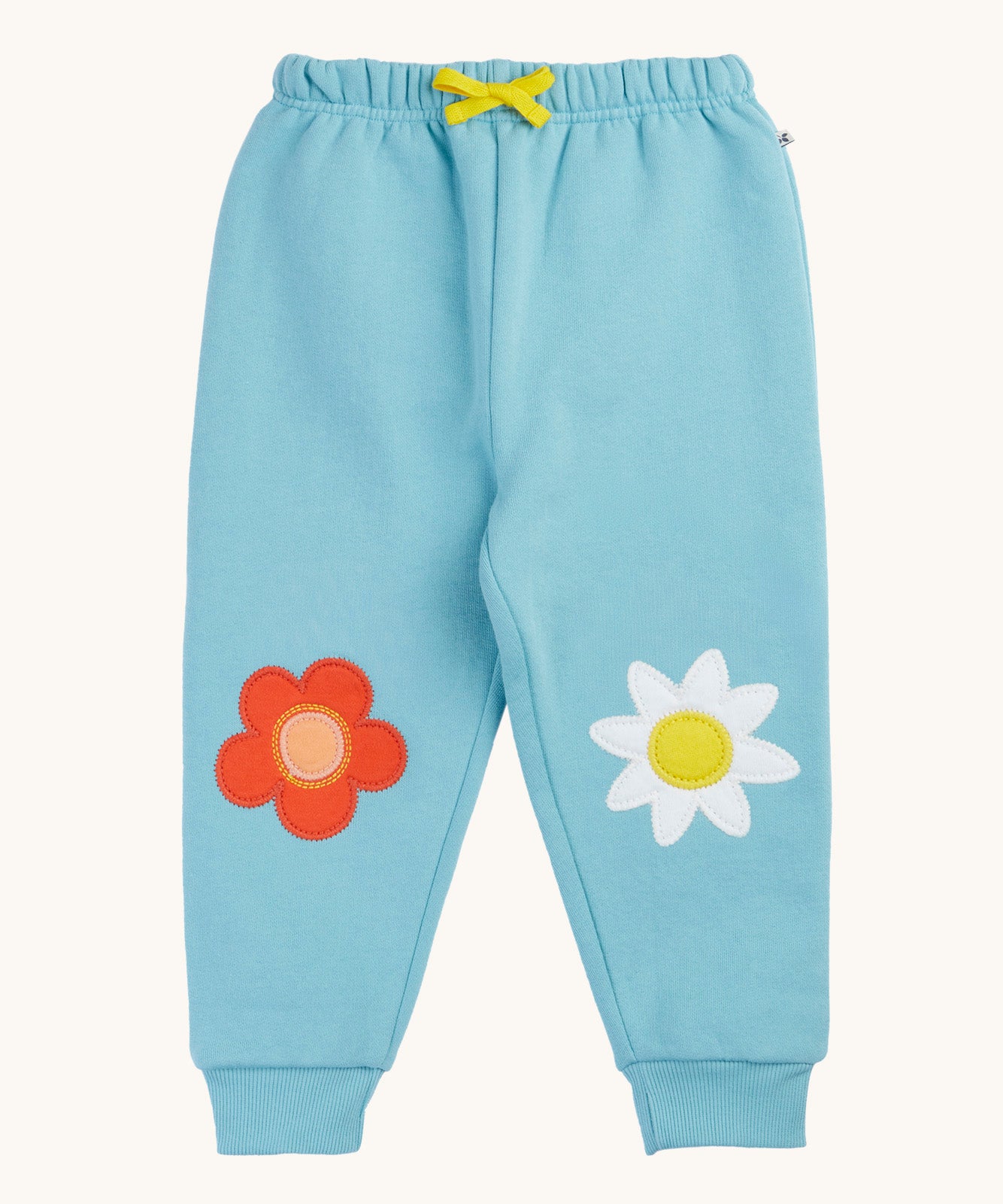 Frugi organic cotton joggers laid flat. In light blue with a red flower applique on one knee and a white flower on the other knee. Features a yellow tie on the waist band