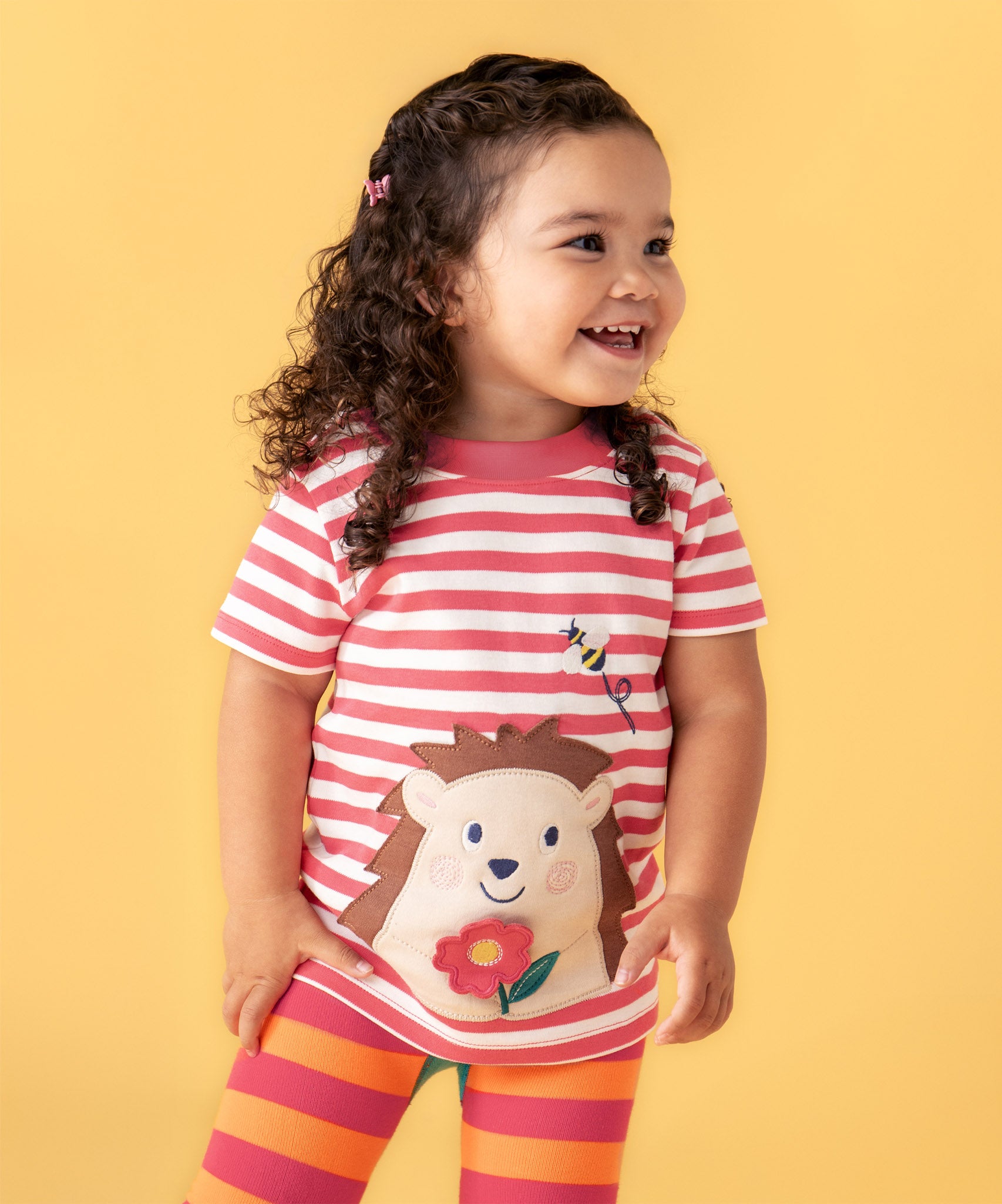 A smiling child standing in front of a light orange background. Wearing the Frugi white and pink stripe cotton short sleeve t-shirt with a cute hedgehog patch on the bottom.