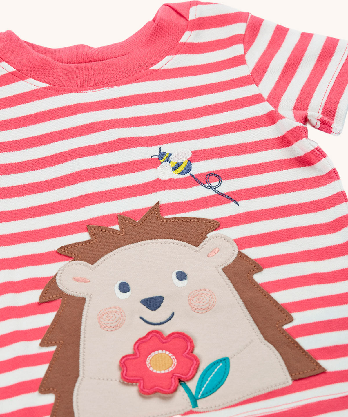 A close up of the hedgehog applique on the front of the Frugi Easy On pink breton stripe hedgehog applique short sleeved organic cotton T-Shirt. The hedgehog is holding a pink flower and there is a little bee flying above.