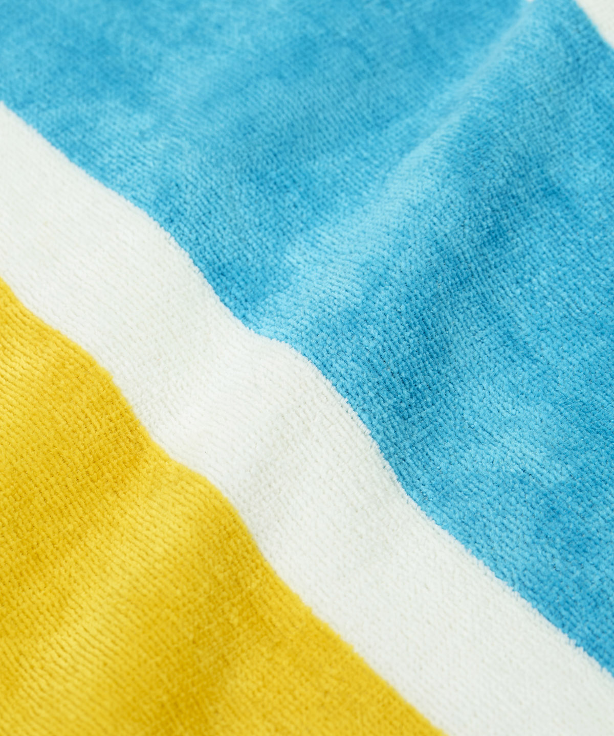 A close up of the Frugi towelling hooded swim towel showing the blue and yellow and white stripe design