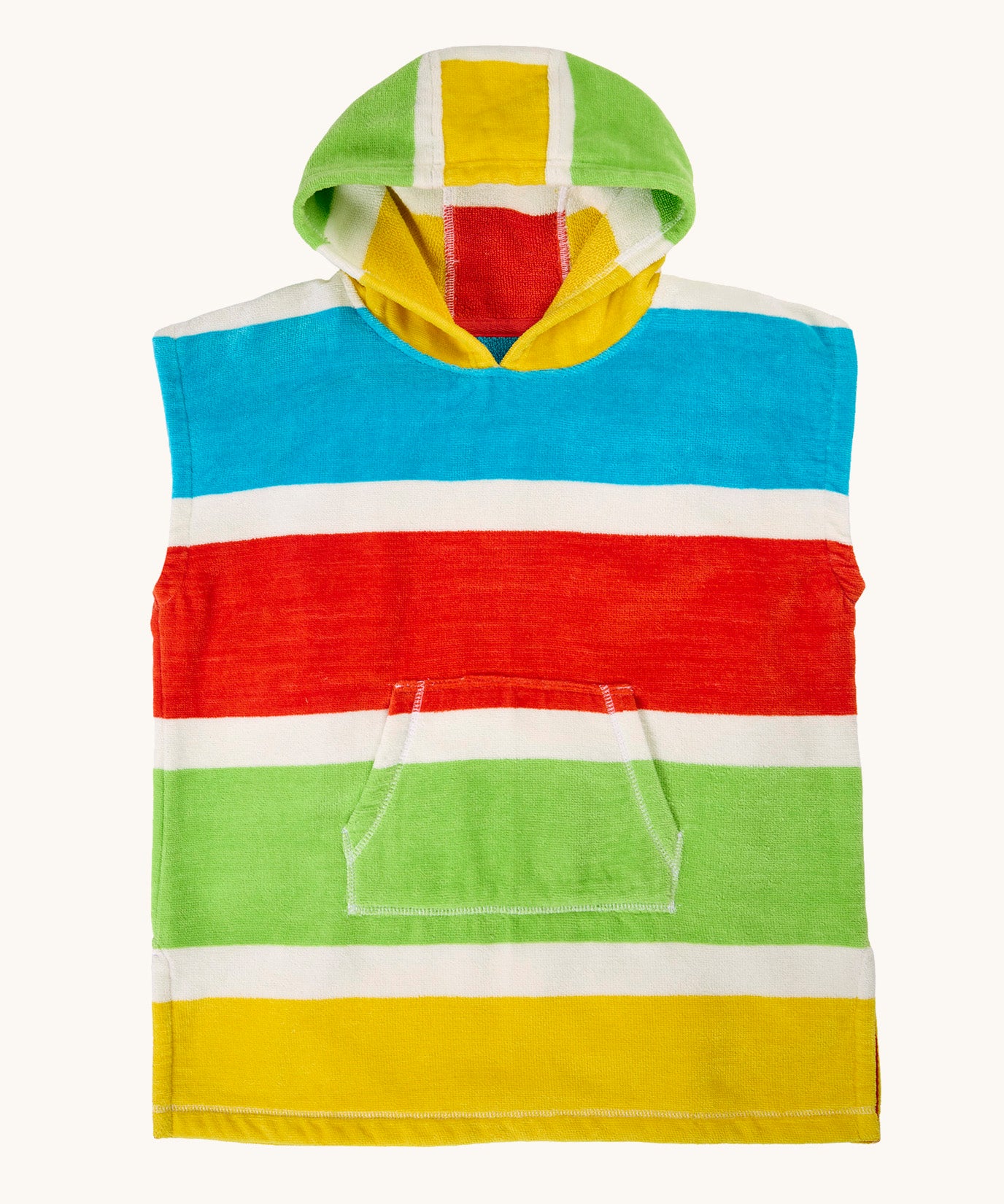 Frugi towelling hooded swim towel in bold bright coloured stripes. Features a pouch pocket on the front.