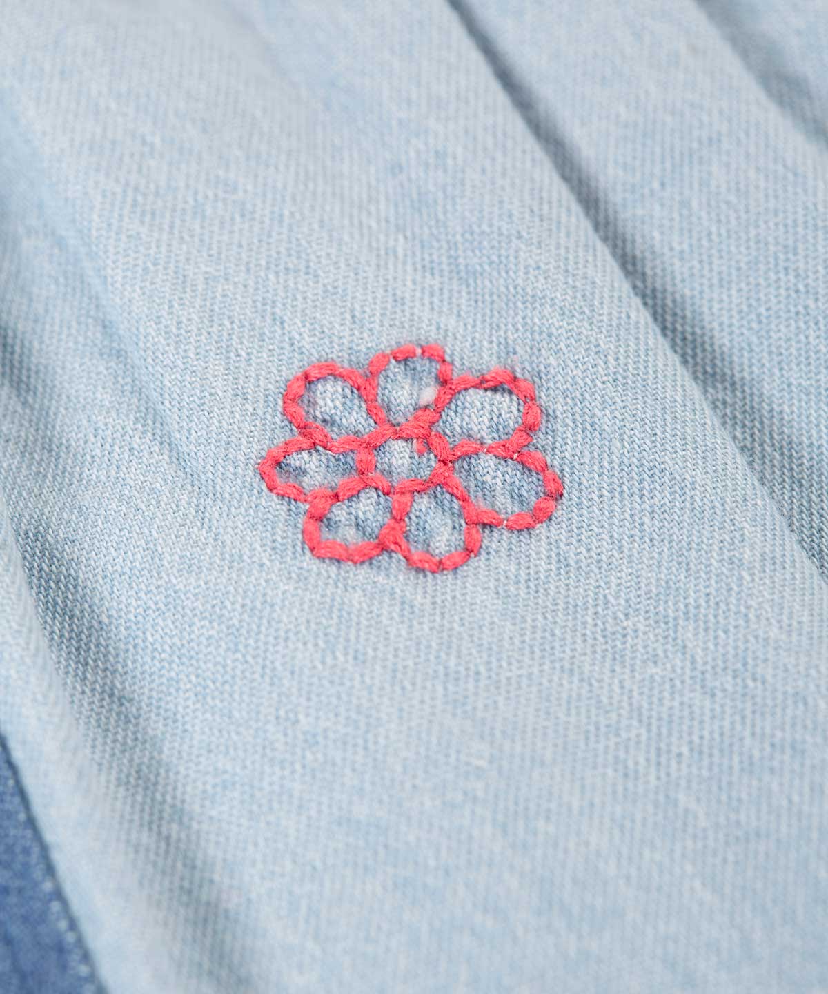 A close up of a pink coloured embroidered flower outline detail on the Frugi denim children's organic denim skirt.