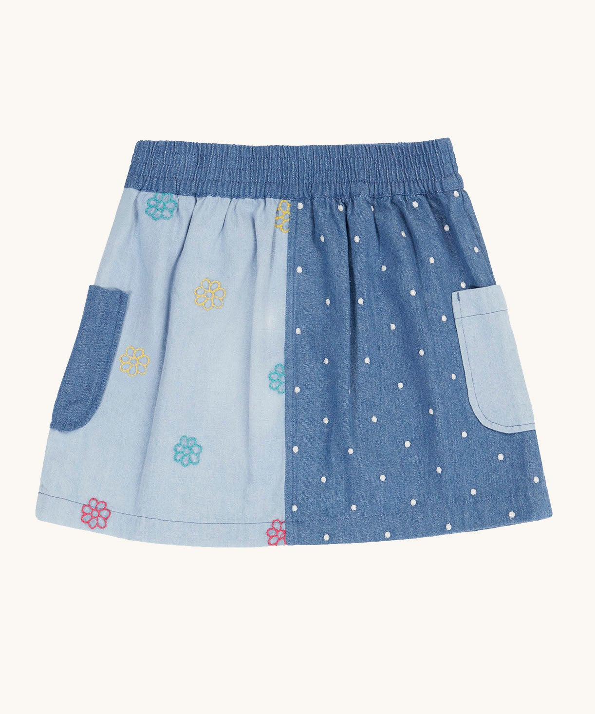The back of the Frugi denim children's organic denim skirt with side pockets and an elasticated waist. One side is a darker denim with white polka dots all over with the other side being a lighter denim decorated with embroidered flower outlines.