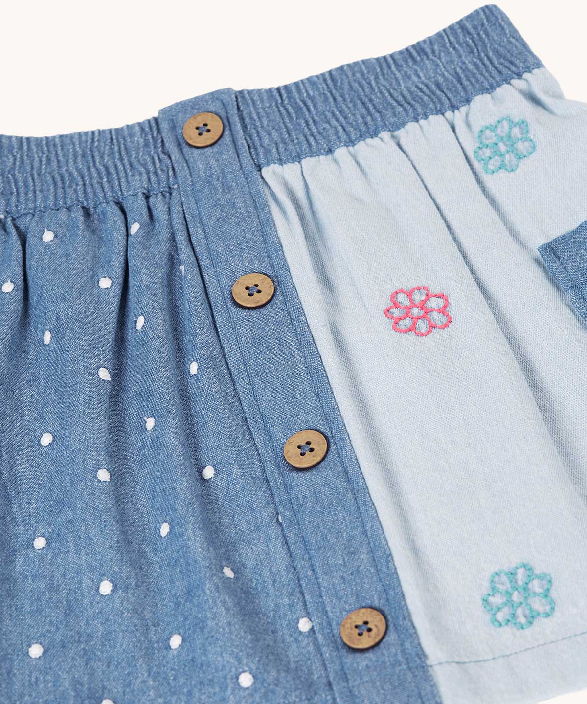Frugi denim children's organic denim skirt with side pockets and wooden buttons down the front. One side is a darker denim with white polka dots all over with the other side being a lighter denim decorated with embroidered flower outlines.