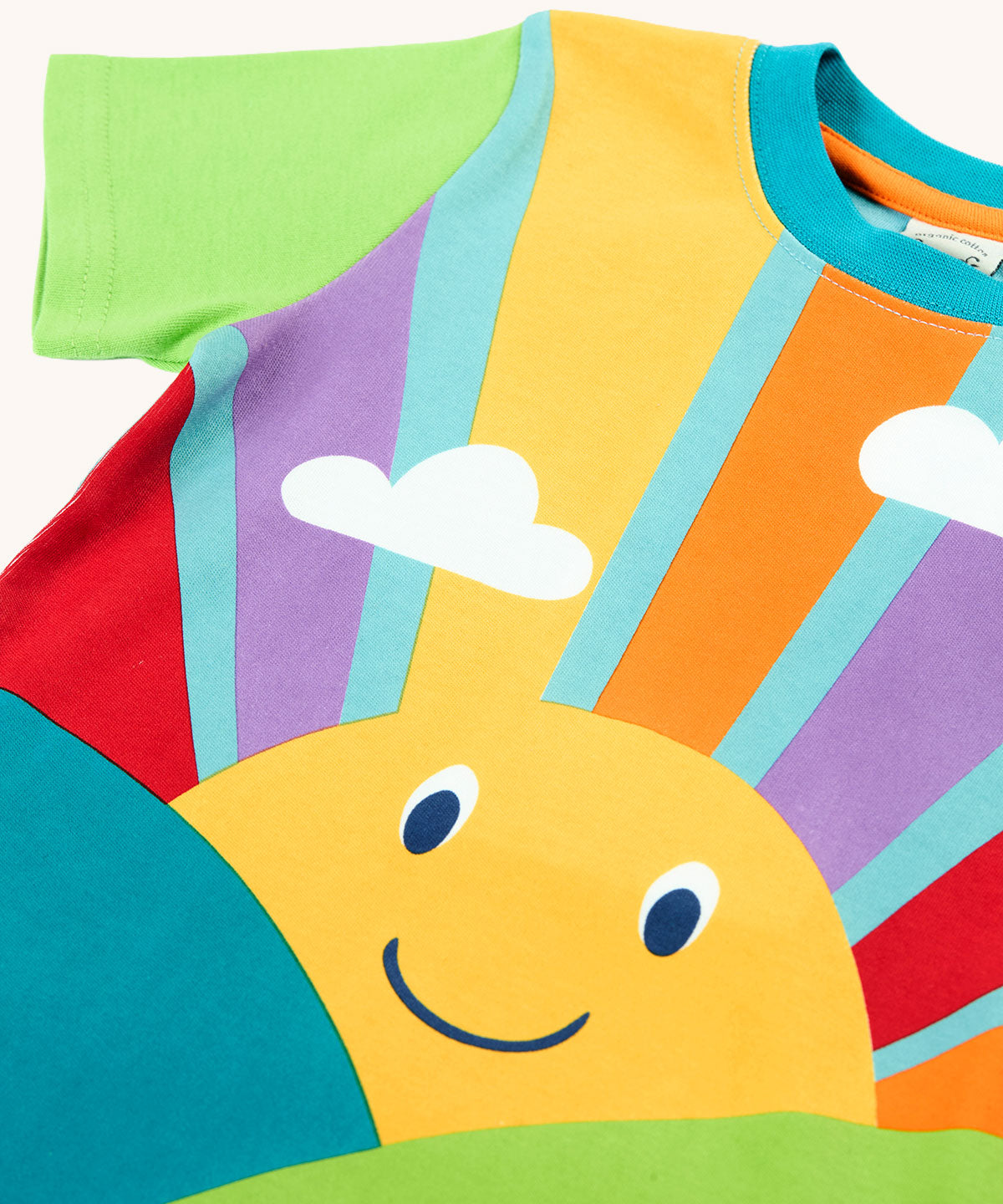 The Frugi Iori Printed T-Shirt is an organic cotton short sleeve kids' top featuring a joyful sunshine print. The colourful design shows a smiling sun peeking over rolling green hills, with bold rays of rainbow light spreading across the front.