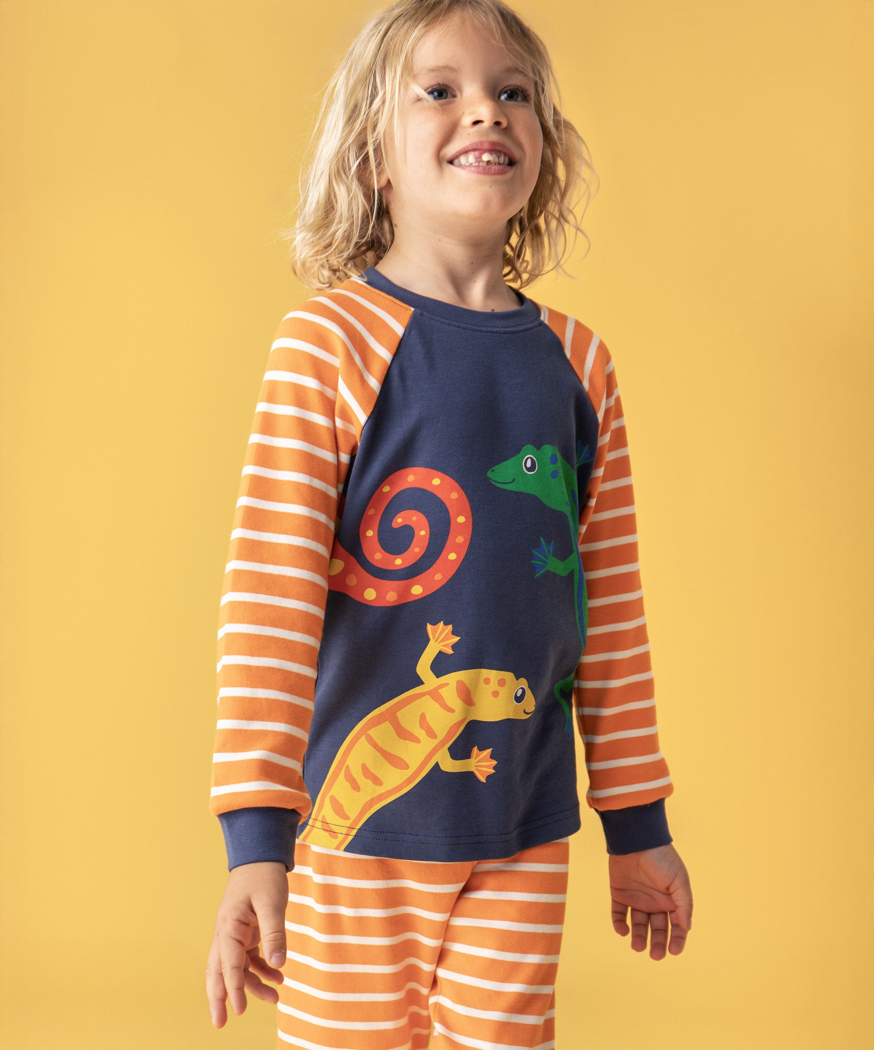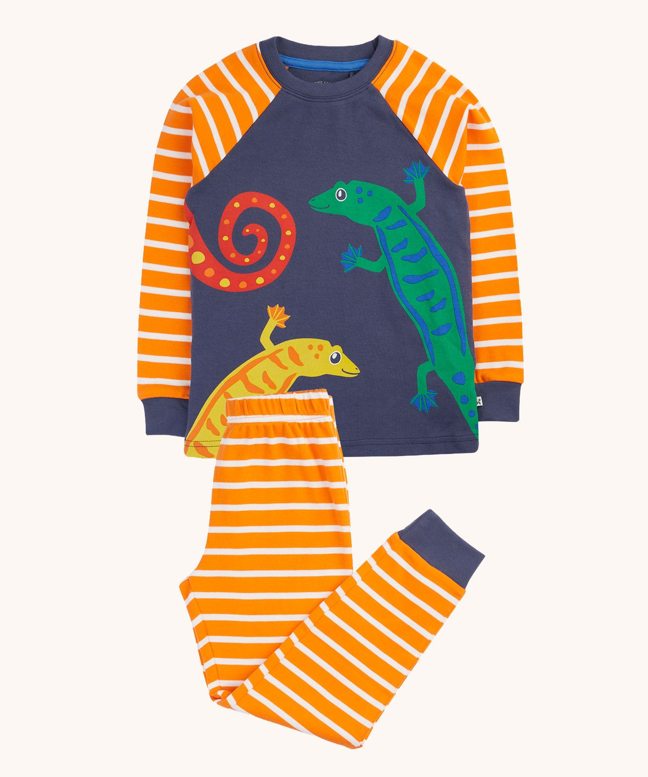 Frugi gecko orange breton stripe organic cotton kids pyjamas. A navy long sleeved top with orange breton striped sleeves with geckos on the front and matching breton striped trousers.