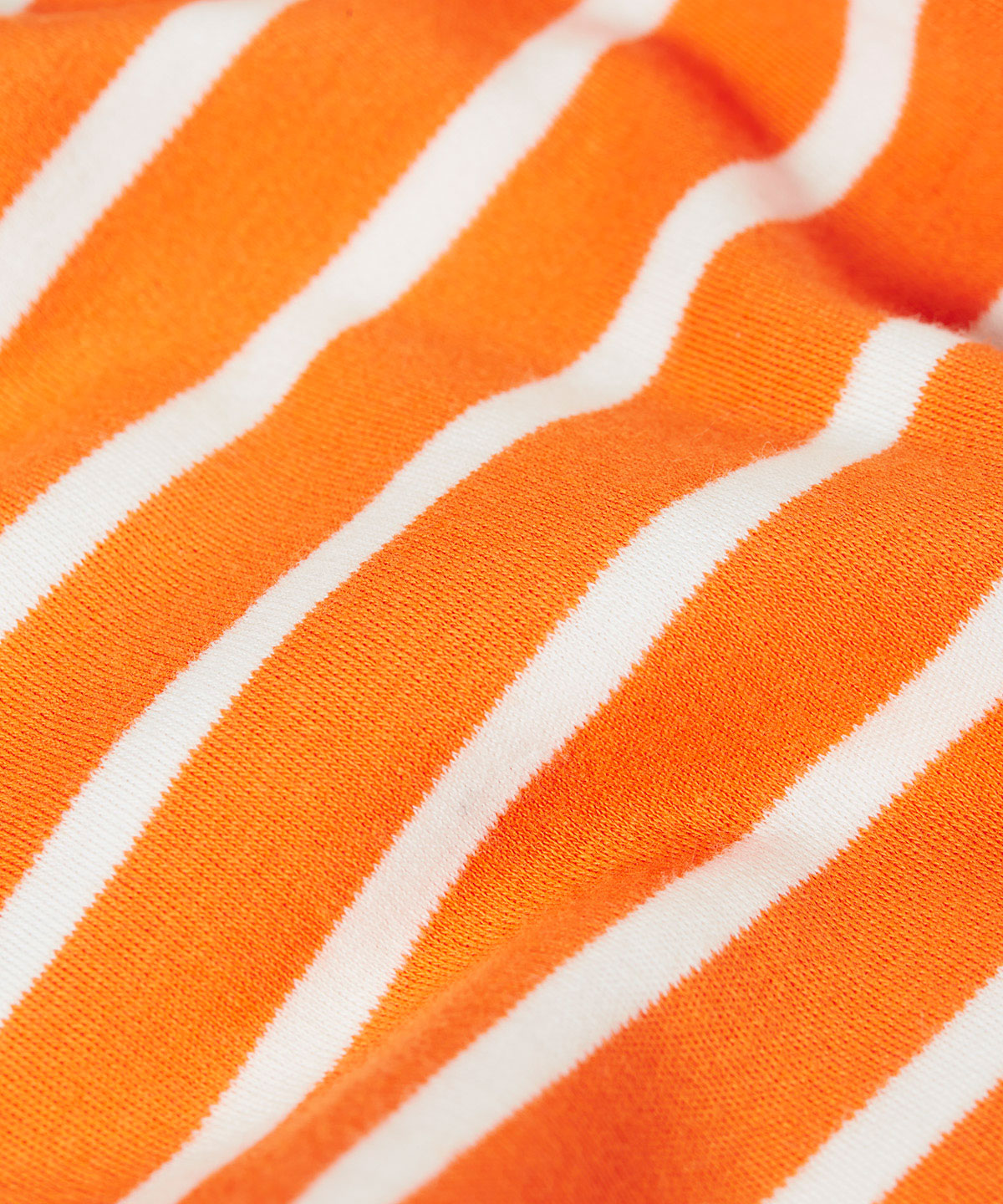 Close up of orange and white breton striped material on the Frugi kernow pyjamas with geckos.