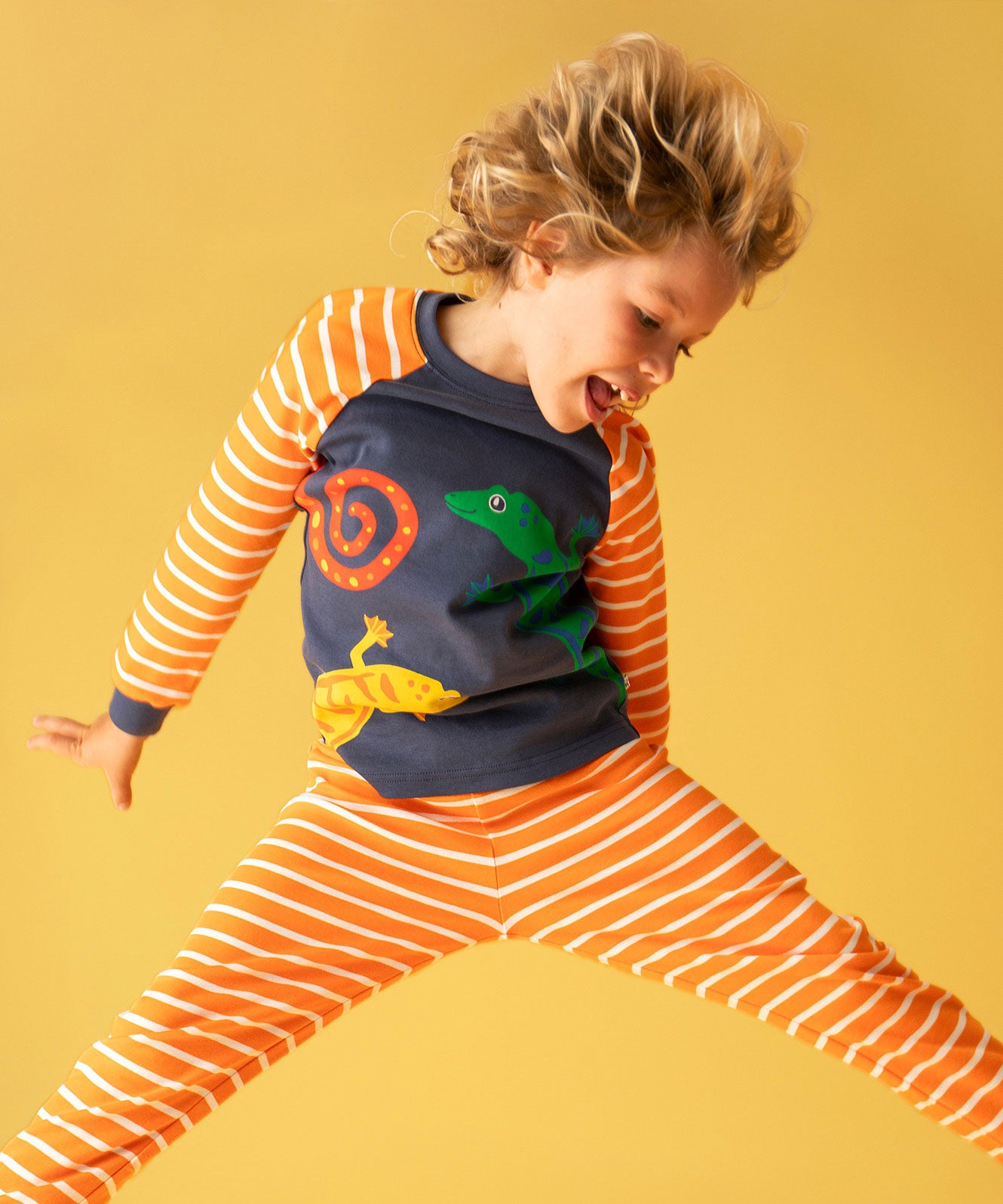 A child jumping in the air in front of a yellow background wearing the Frugi gecko orange breton stripe organic cotton kids pyjamas. A navy long sleeved top with orange breton striped sleeves with geckos on the front and matching breton striped trousers.