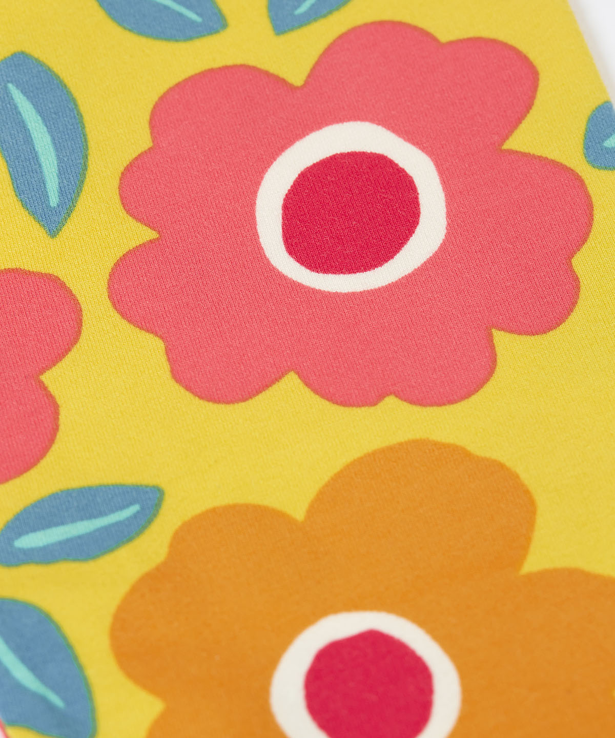 A close up of the repeating floral print on the yellow Frugi leggings