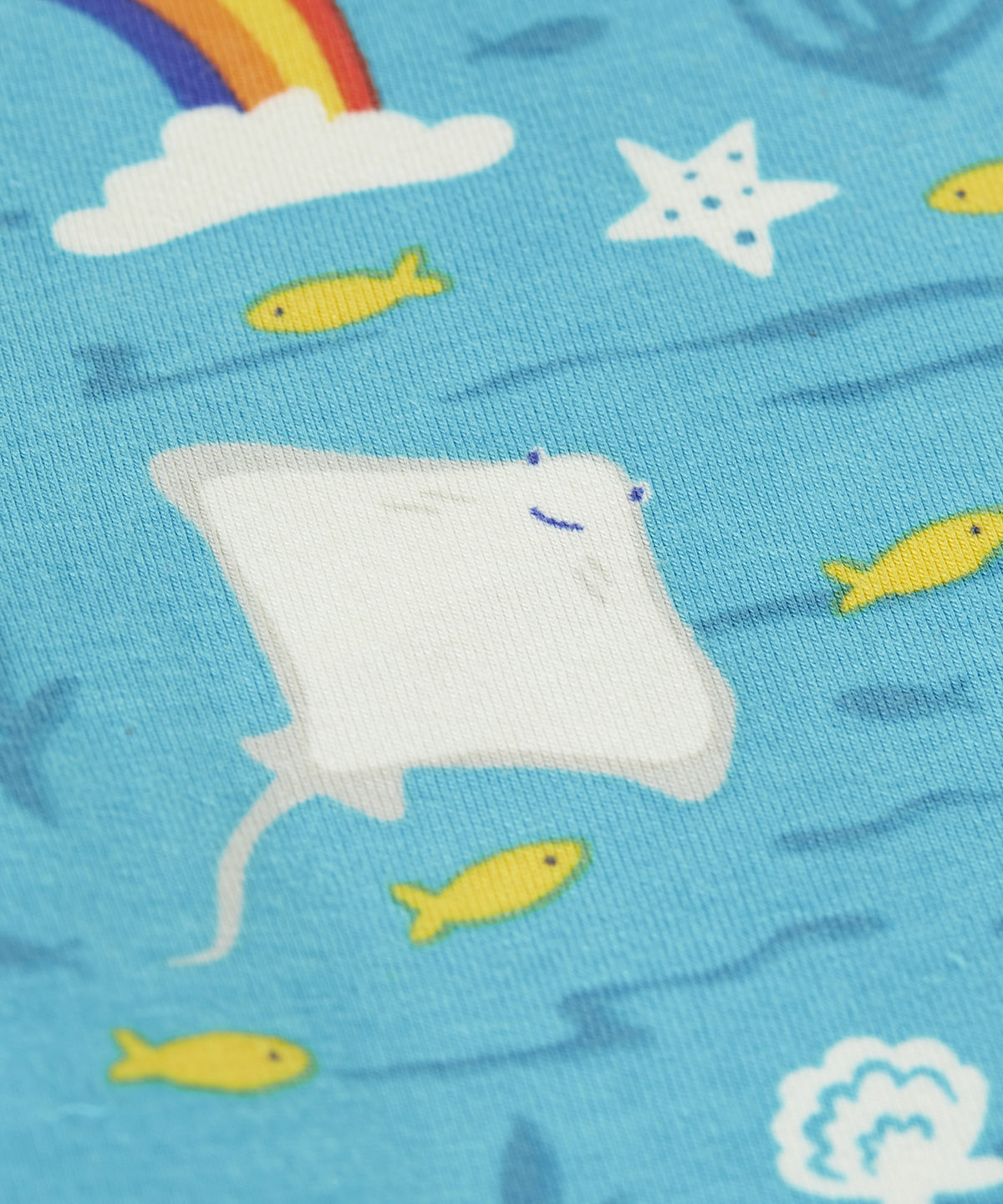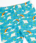 A close up of the repeating grey manta ray and rainbow print on the blue Frugi leggings