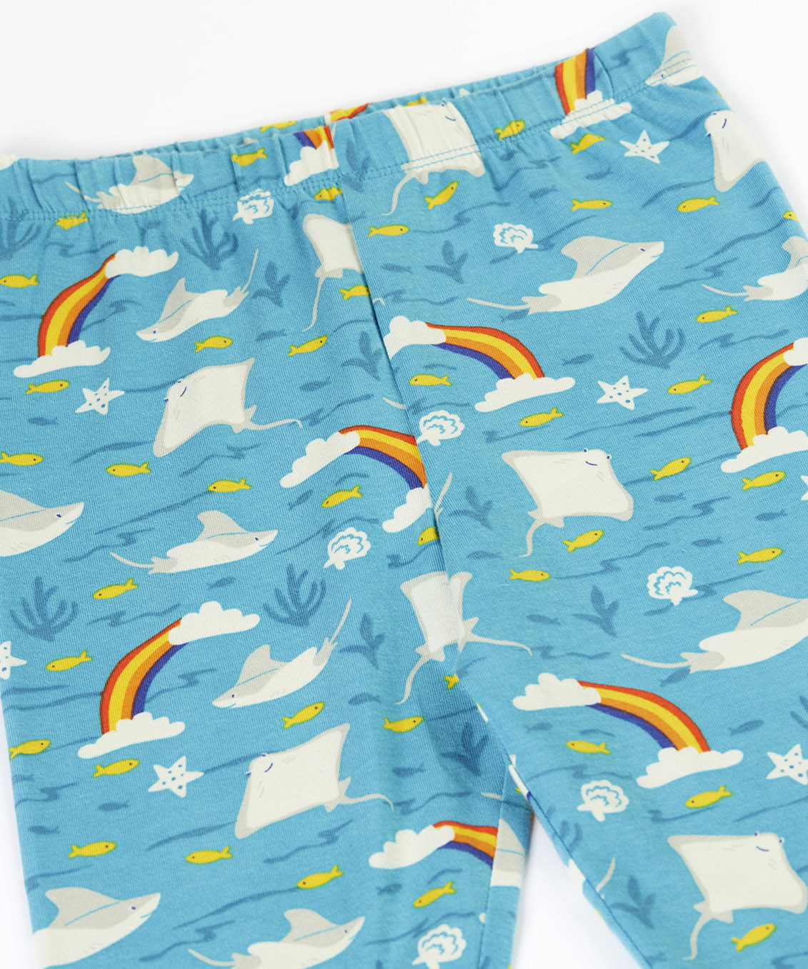 Frugi organic cotton leggings laid flat. In light blue with a repeating grey manta ray and rainbow print.