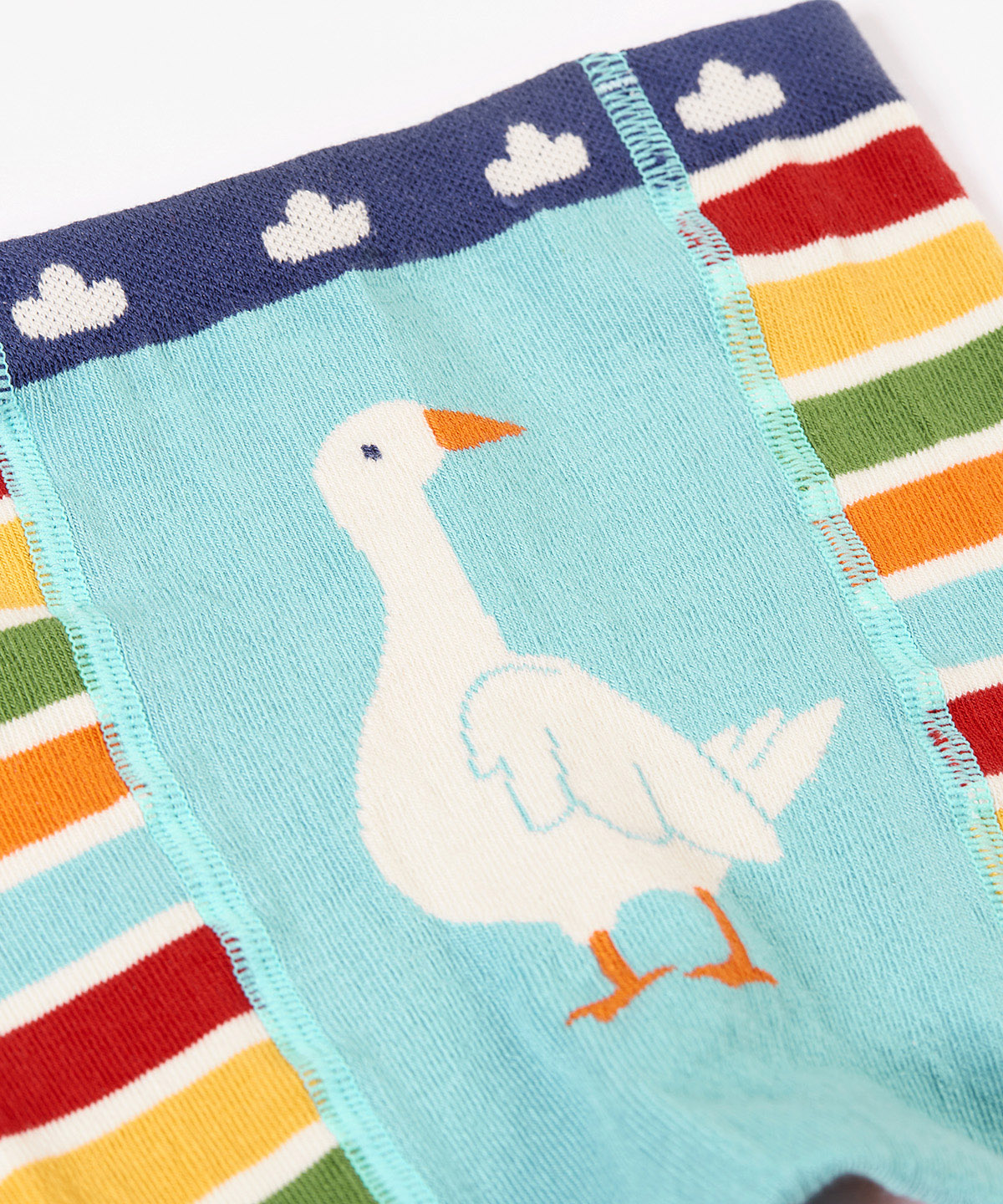 • Rainbow striped design with goose detail on the bum