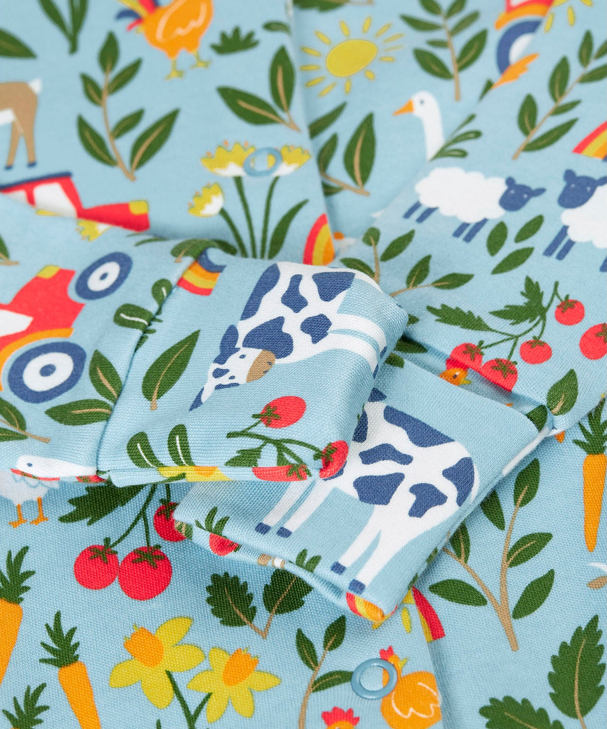 A close up of the light blue Frugi organic cotton footed babygrow laid flat showing the repeating farm themed print and popper fastener runningfrom the neckline