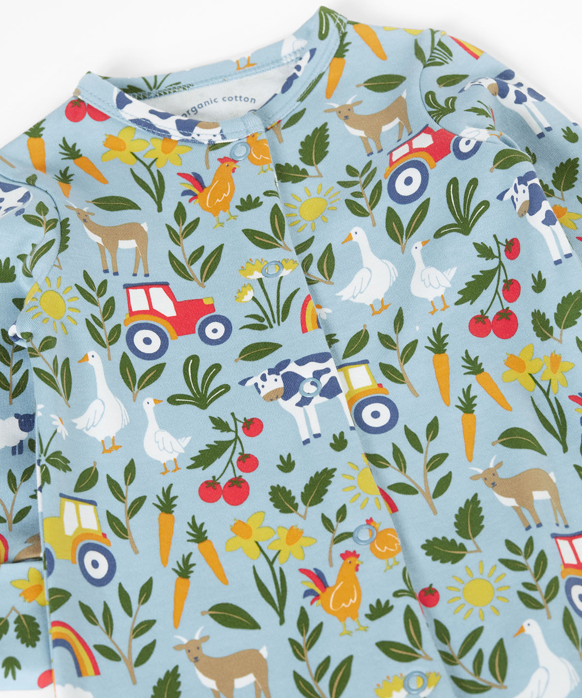 Frugi organic cotton footed babygrow. In light blue with a repeating farm themed print and a popper fastener from the neckline down the legs.