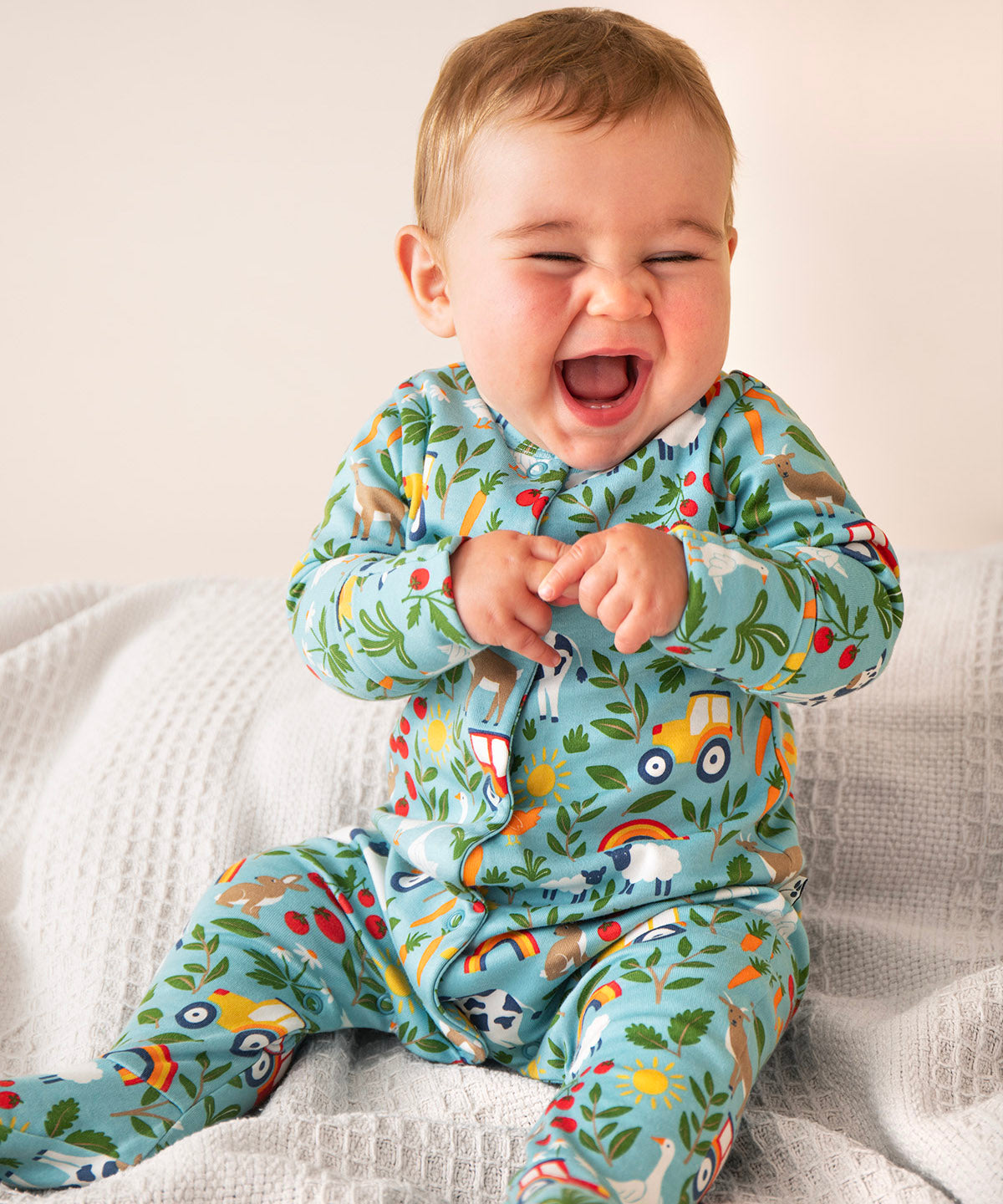A baby laughing and sitting on a soft grey blanket. Wearing the light blue frugi footed babygrow with a repeating farm themed print