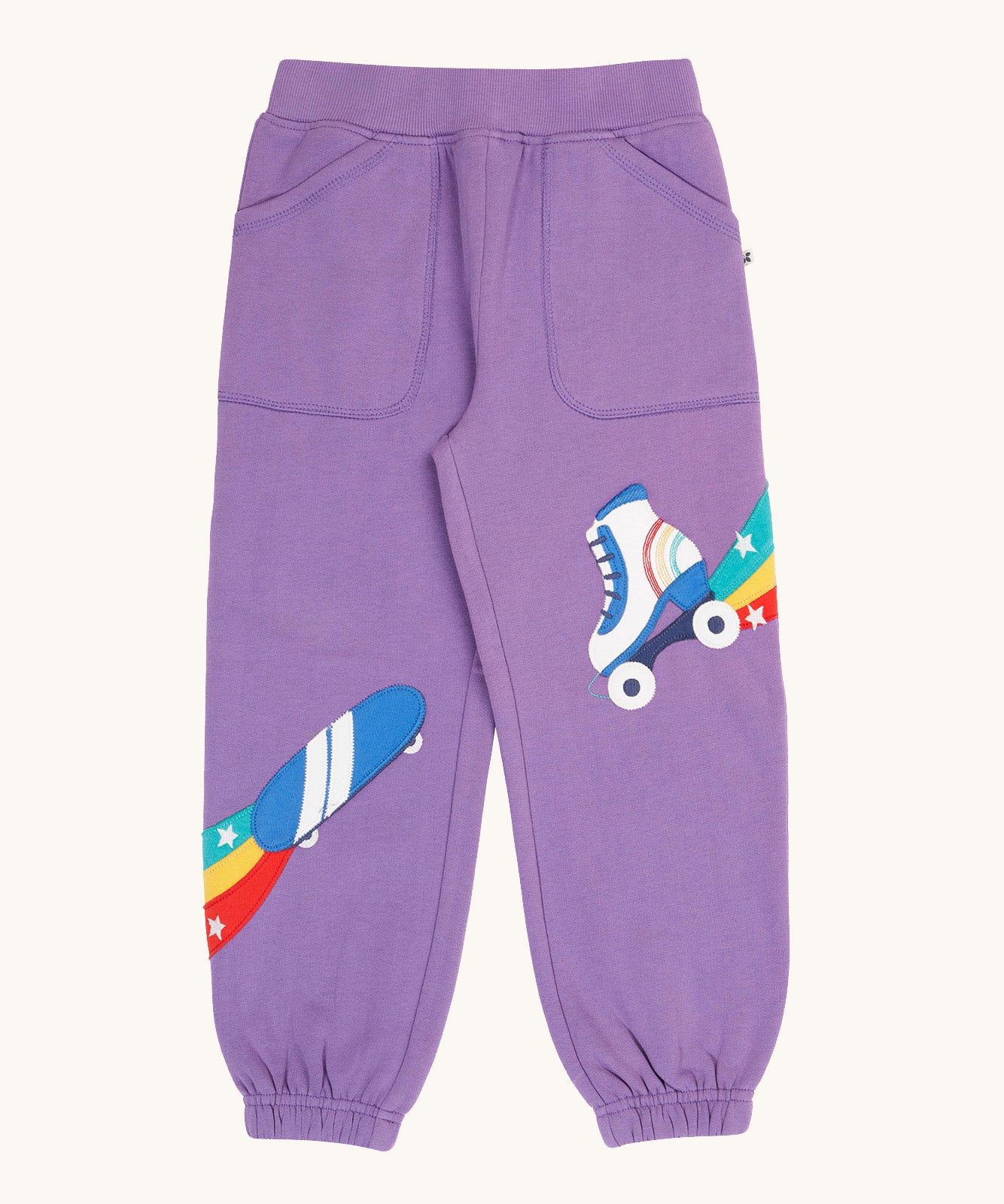 Frugi organic cotton joggers laid flat. In light purple with an skating theme applique on each leg