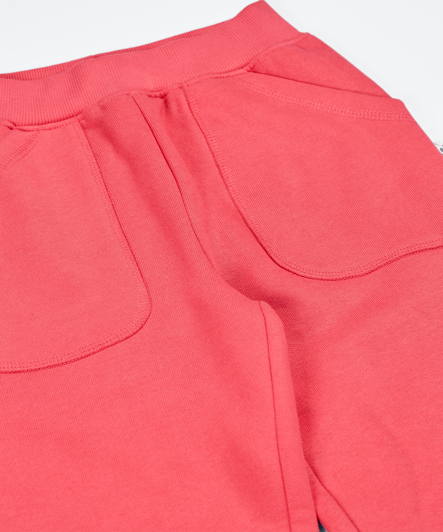 Close up of pink Frugi organic cotton joggers . Shows front pockets and elasticated waist band